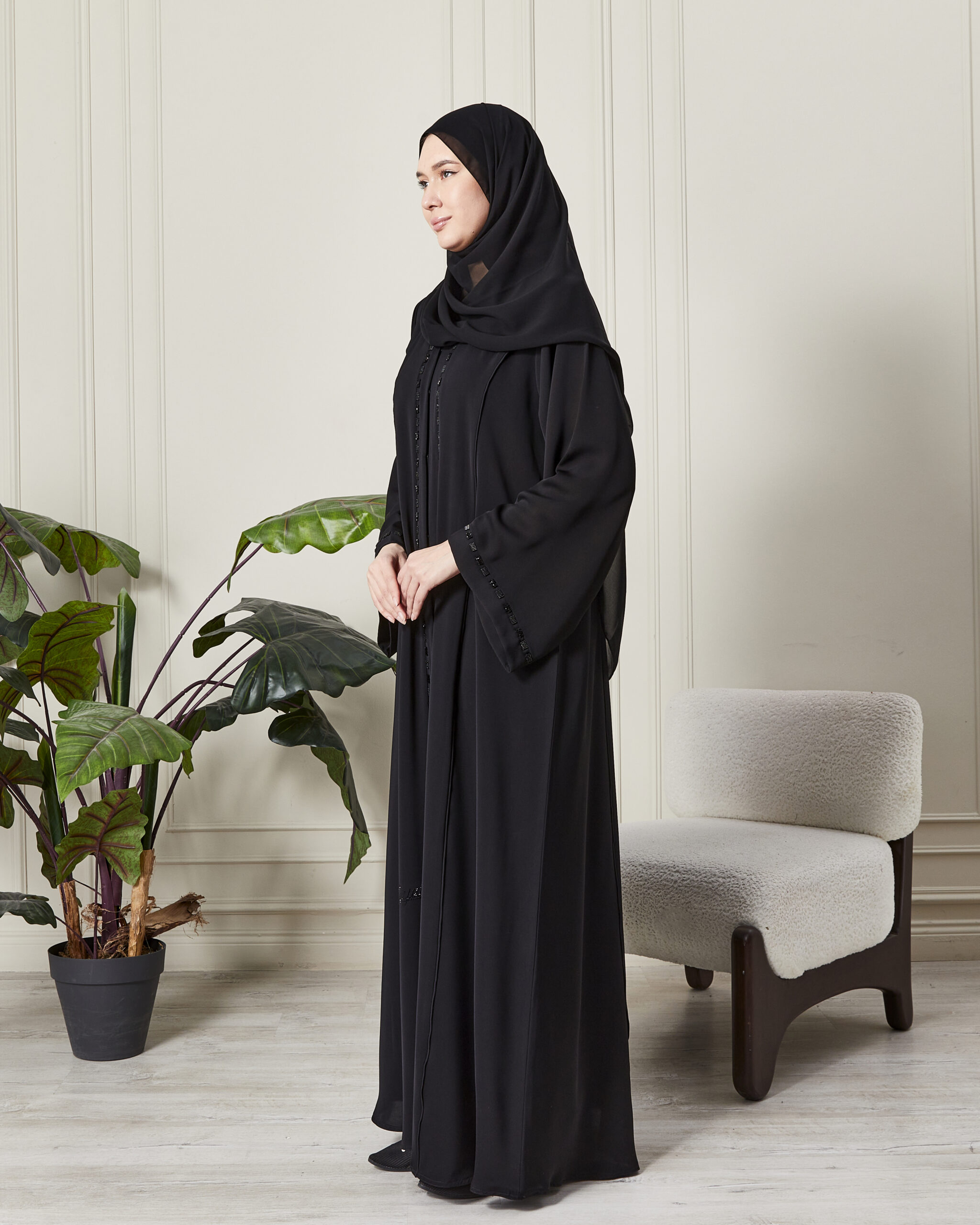 Leyali Dubai | Safir Işıltısı Swarovski İşlemeli Lüks İpek Abaya & Şal Takımı