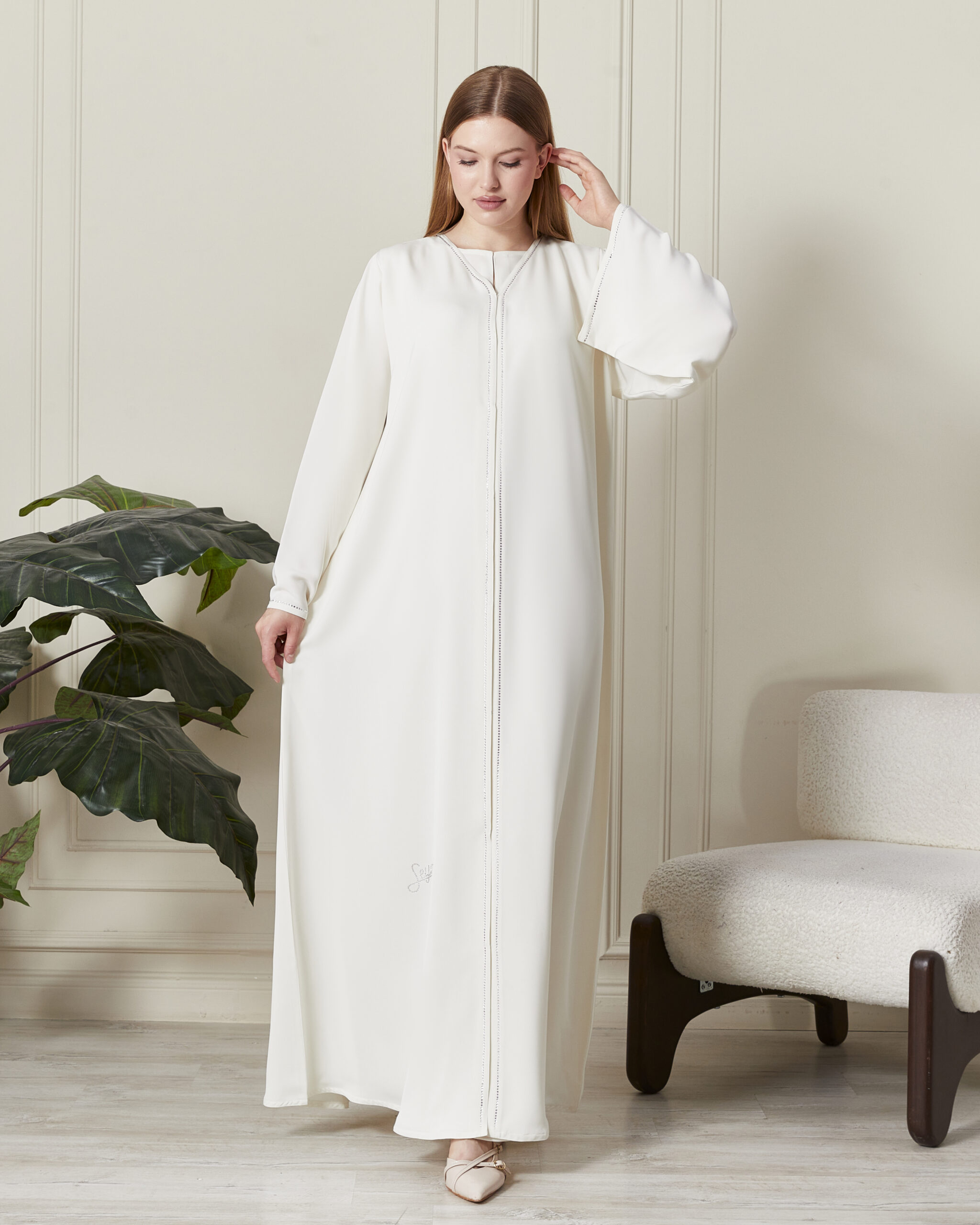 Leyali Dubai | Swarovski Taş İşlemeli İpek Ferace Takımı (Beyaz)