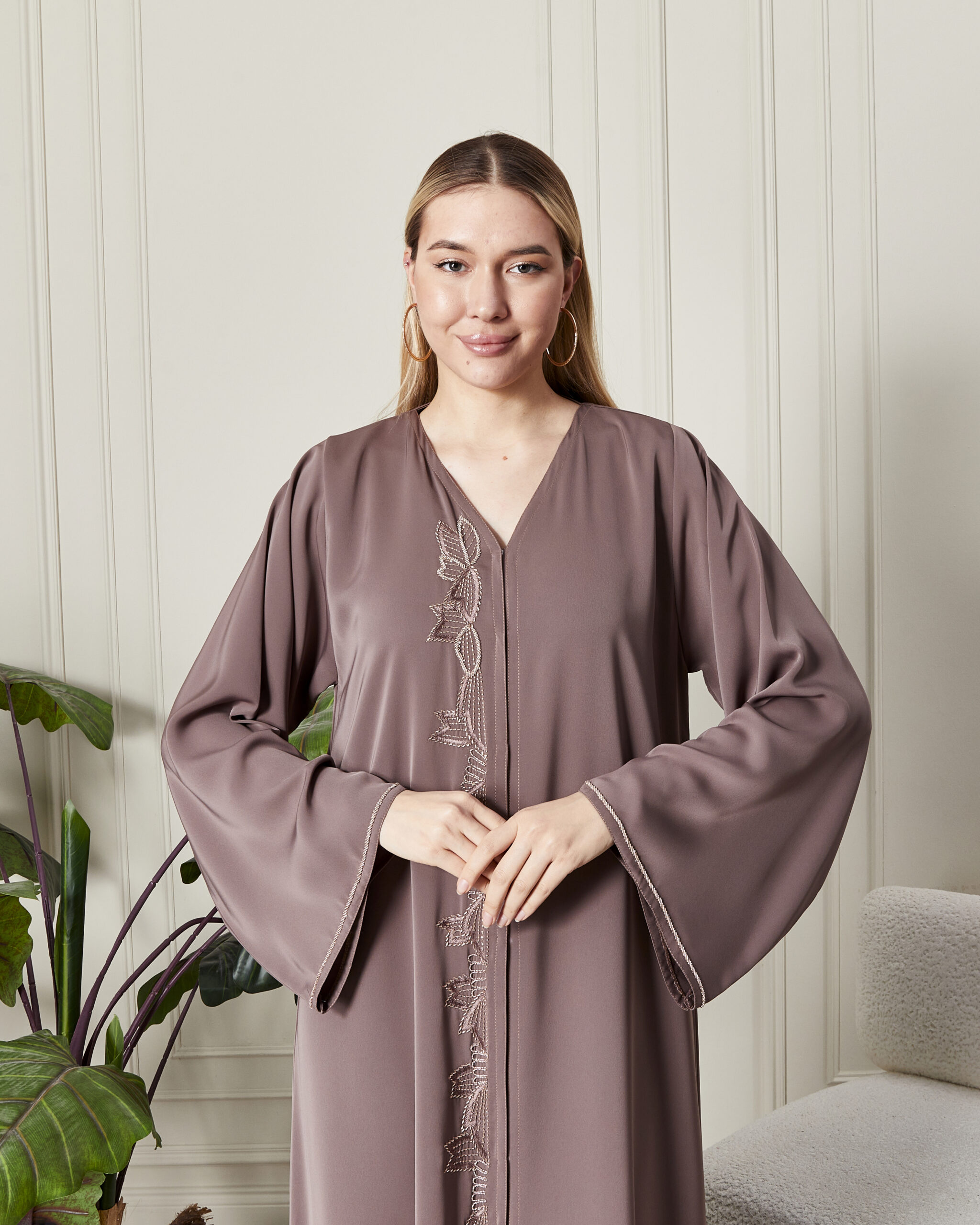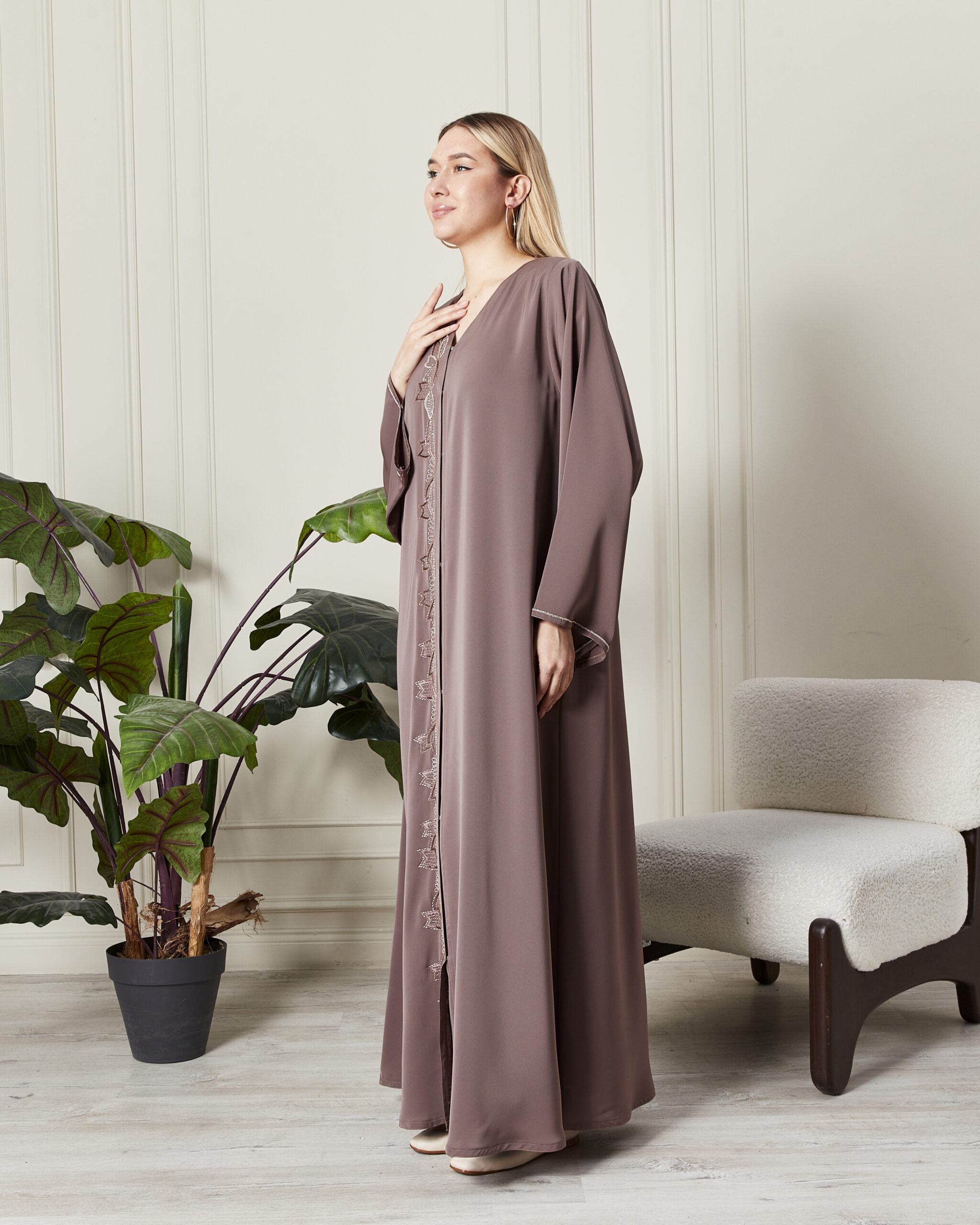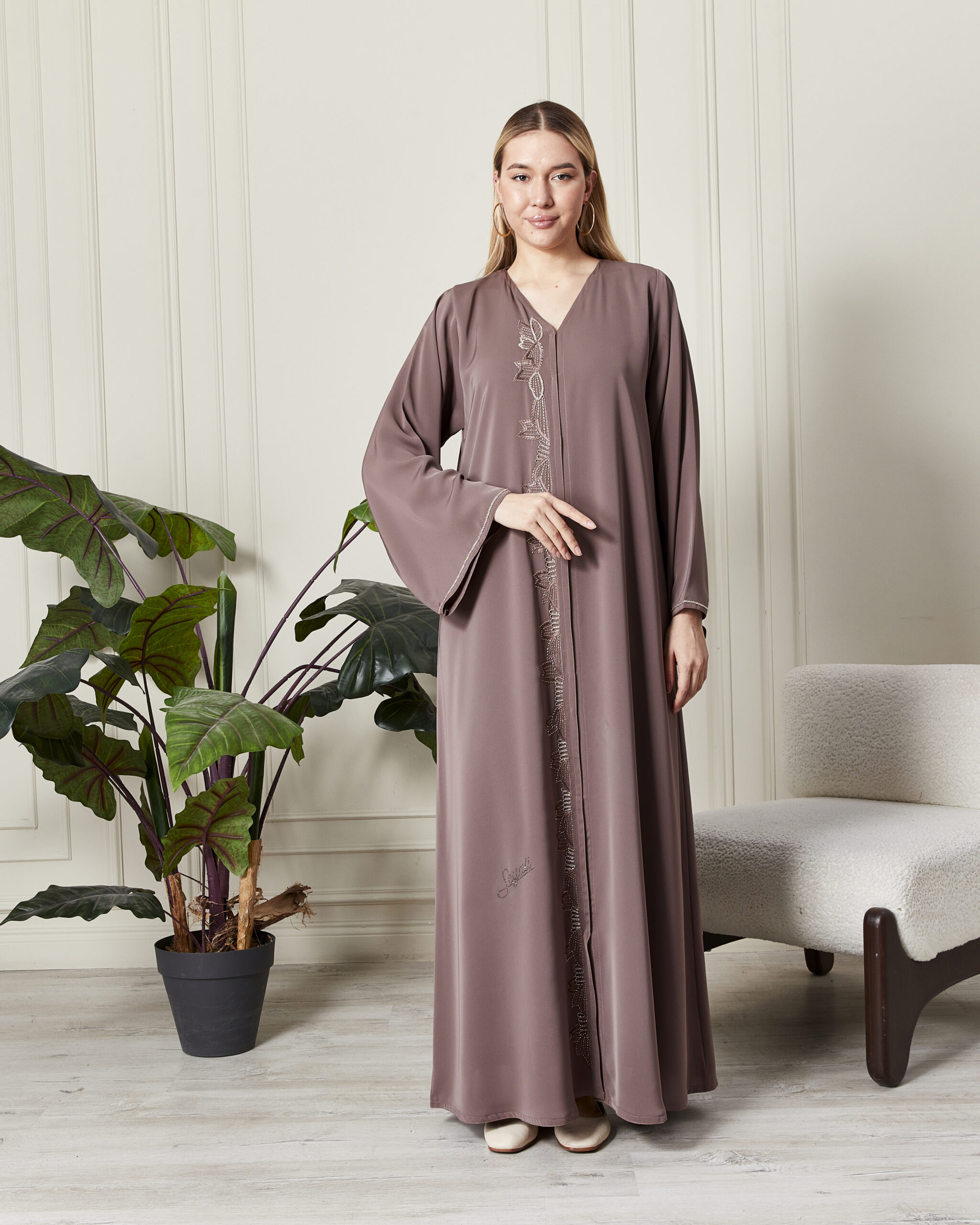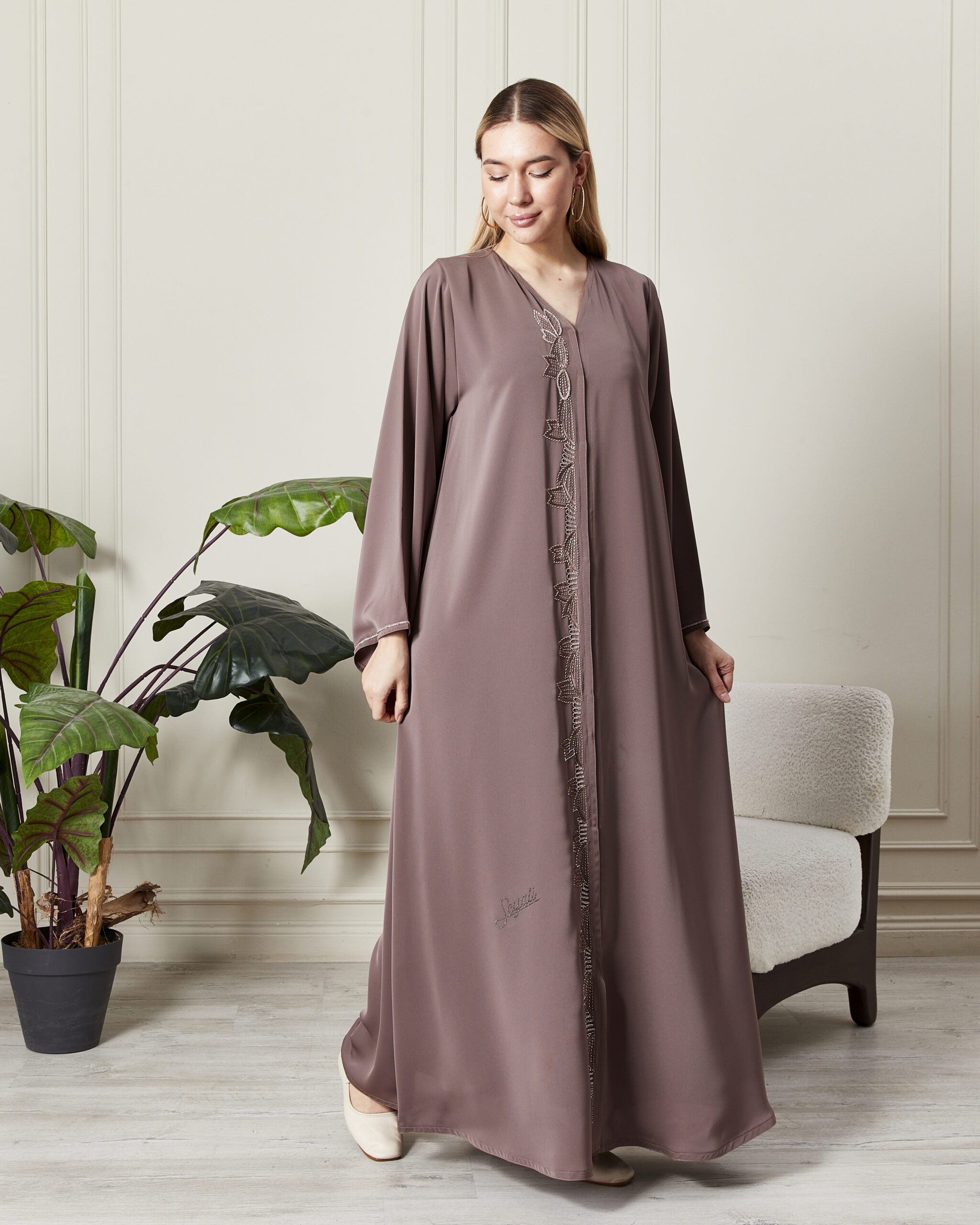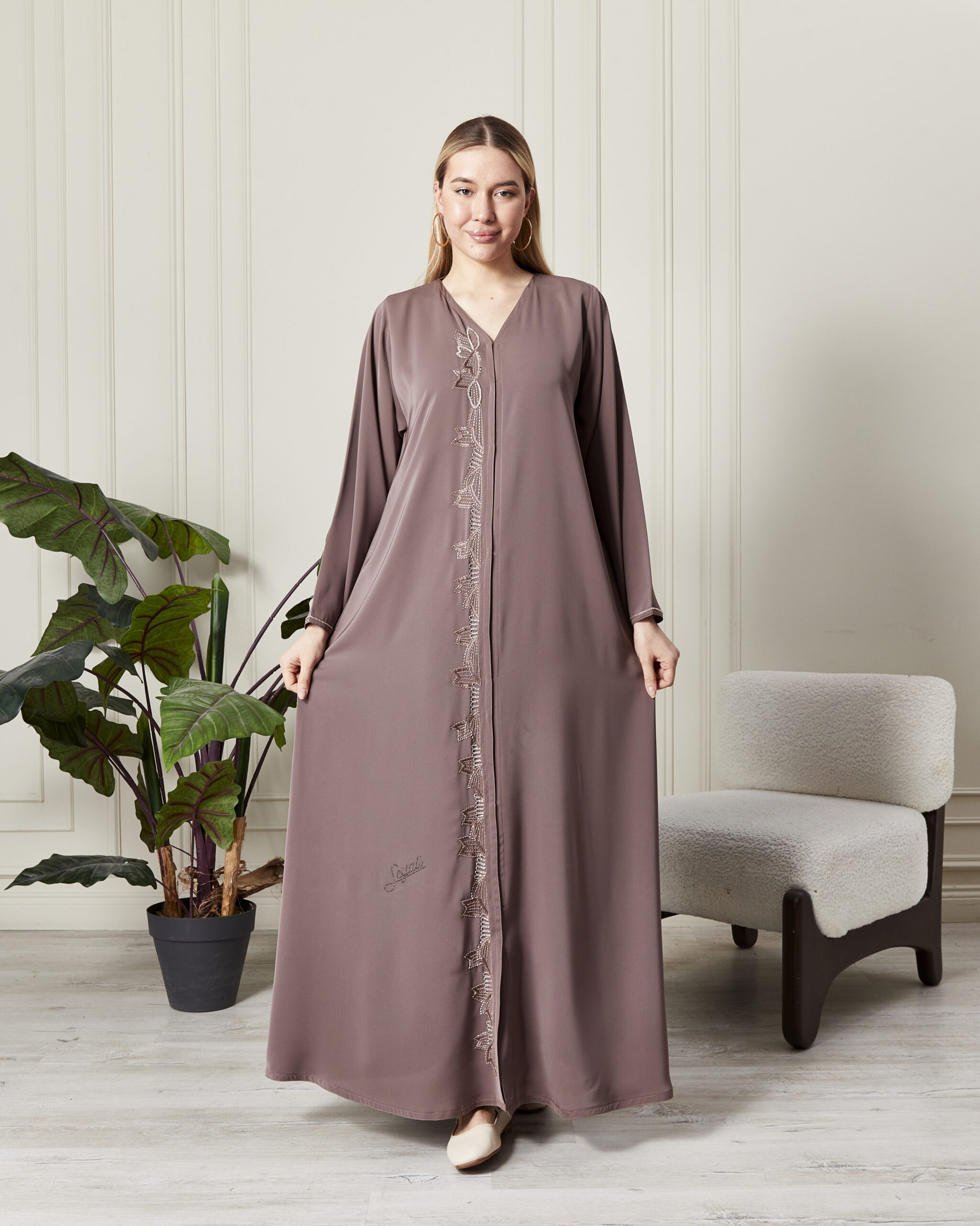 Leyali Dubai koleksiyonunun en yeni ve en soft parçalarından biri olan bu vizon abaya, incelikli nakış işçiliğini modern bir kesimle sunuyor. Dubai’nin usta modelistleri tarafından tasarlanan bu parça, hem rengi hem de dokusuyla zarafeti yeniden tanımlıyor.