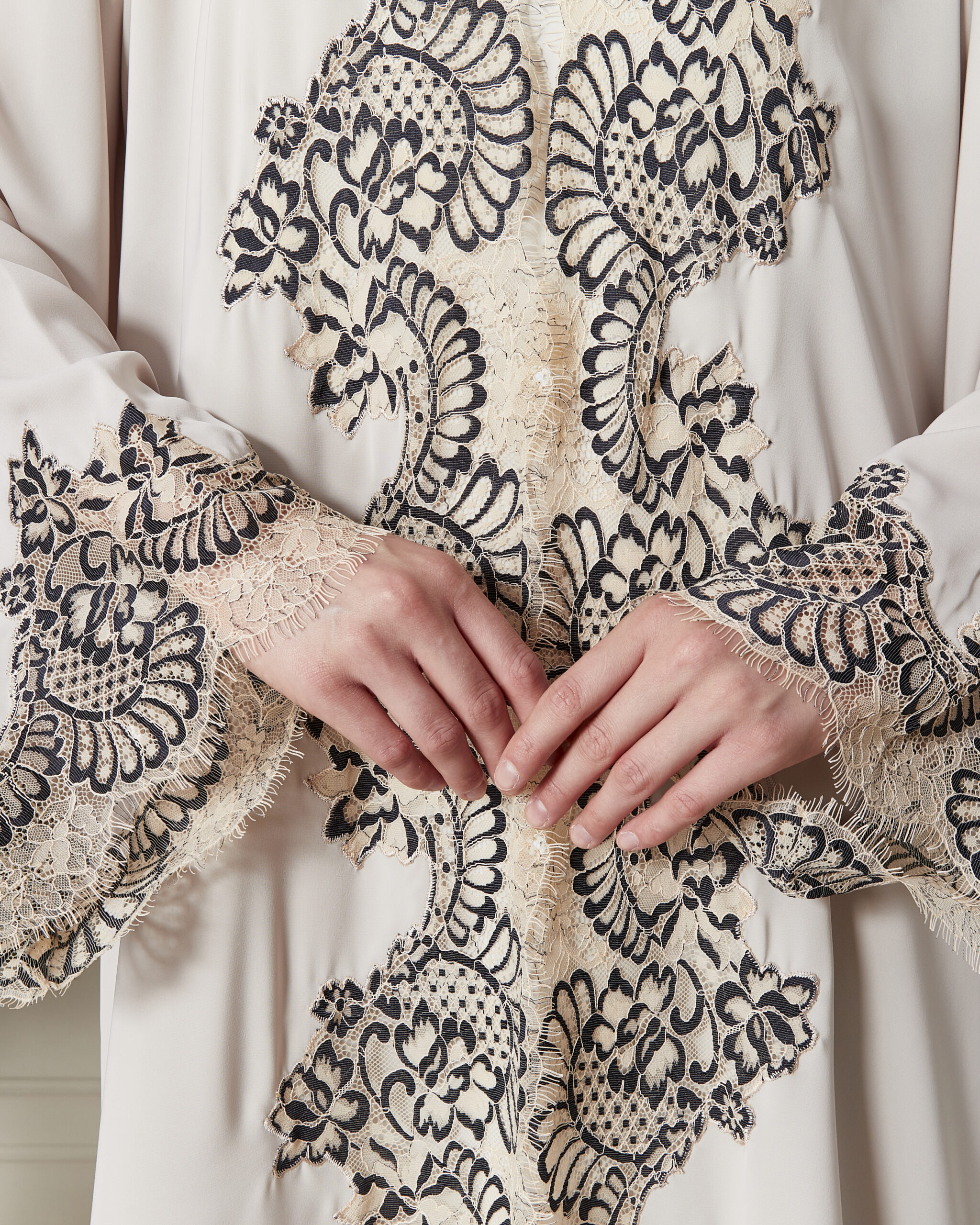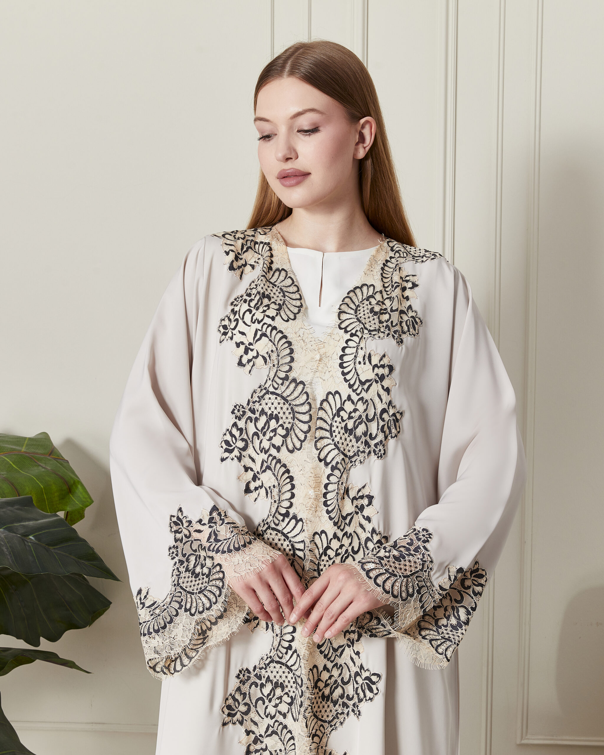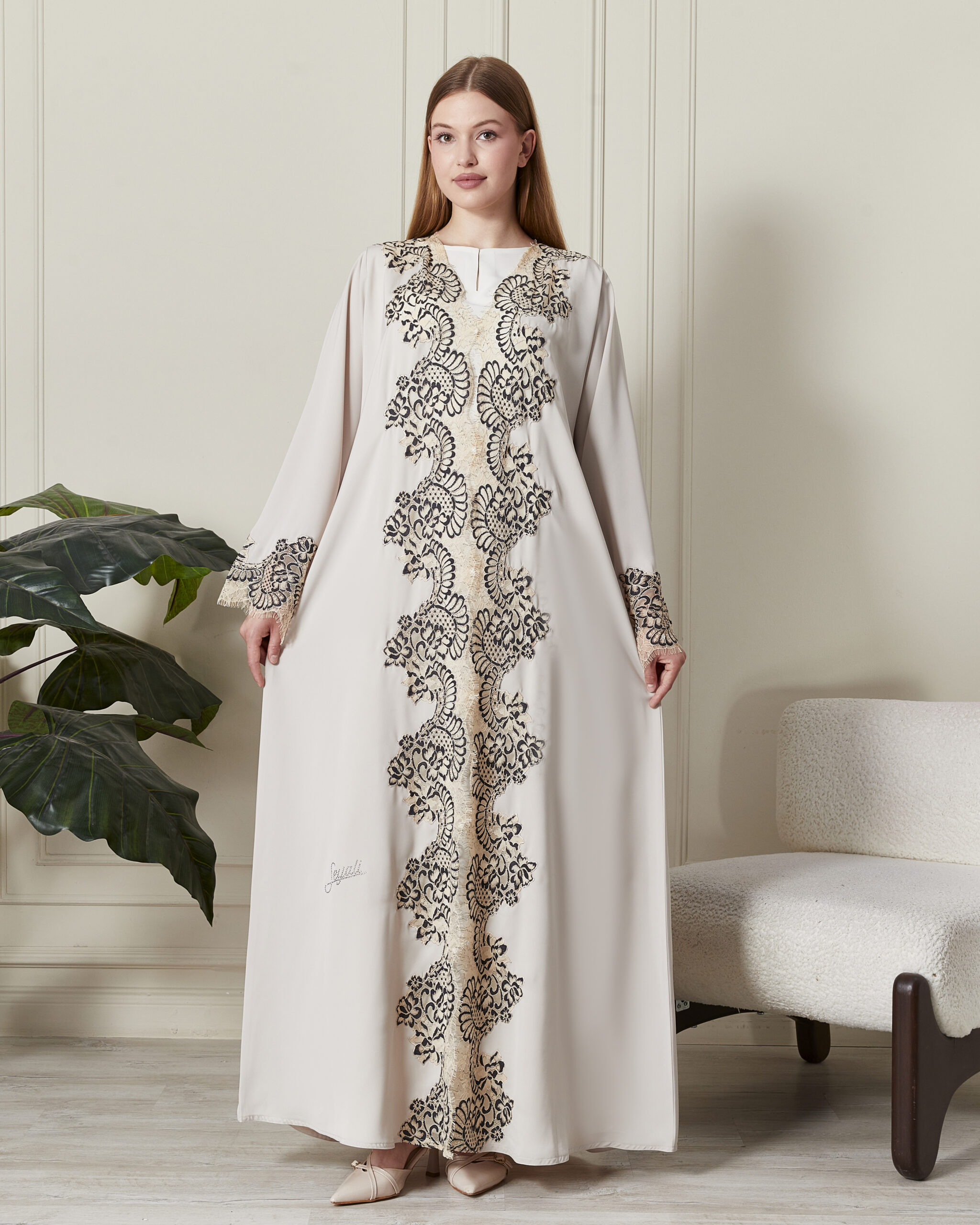 Özel Fransız Dantel İşlemesi: Abayanın ön panelinde ve kol manşetlerinde yer alan yüksek kaliteli Fransız dantelleri, tasarıma vintage bir zarafet ve sofistike bir hava katar.