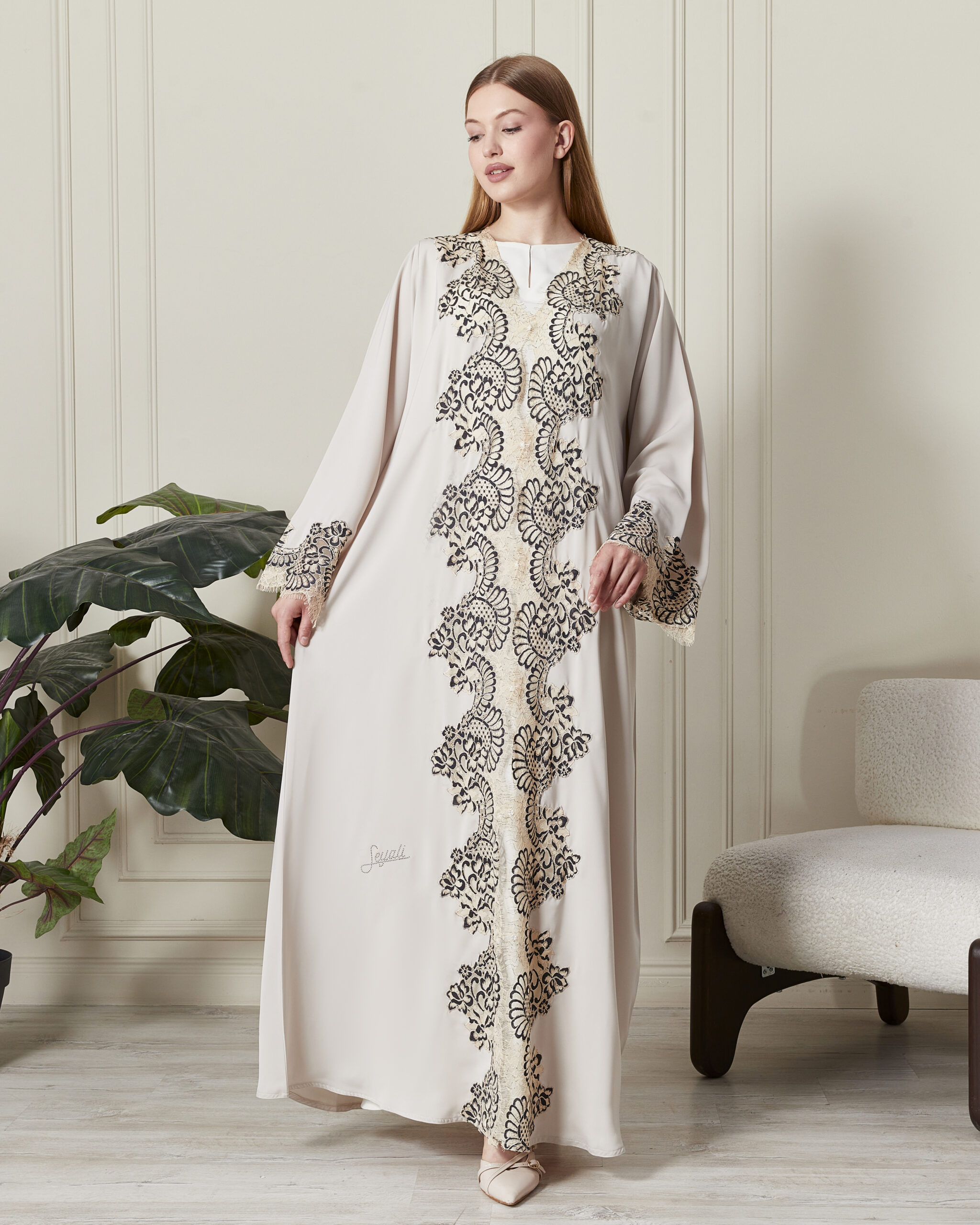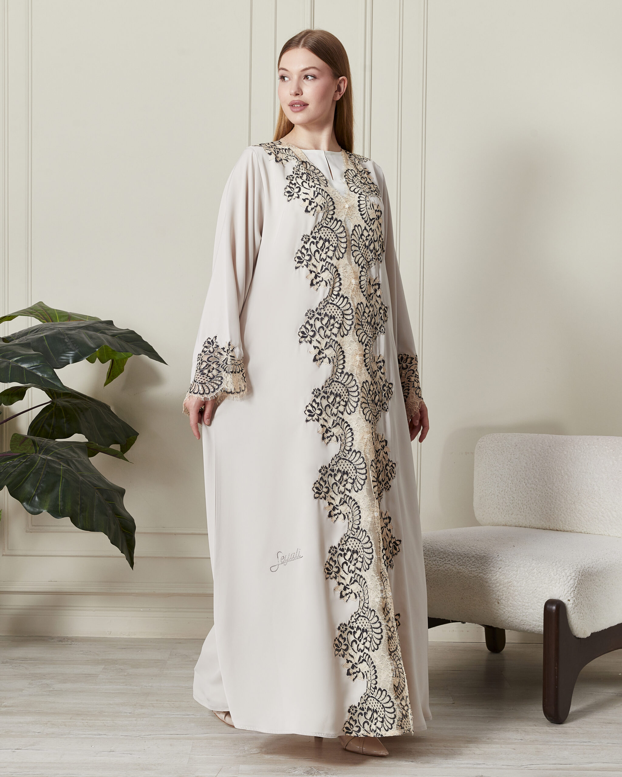 Zarafeti yeniden tanımlayan bu özel üretim abaya, romantik Fransız dantel detayları ve lüks ipek kumaşıyla büyüleyici bir duruş sergiliyor. Her dikişinde Dubai’nin usta işçiliğini barındıran bu tasarım, özel günlerinize asalet katmak için hazırlandı.