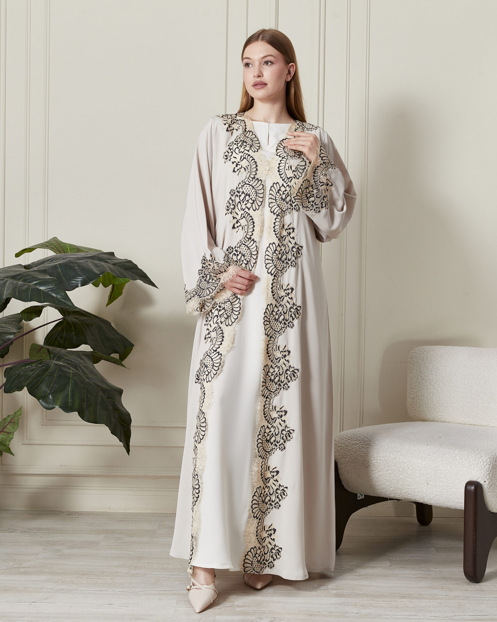 Fransız dantelinin romantik dokusu sayesinde bu abayayı, zarif bir topuklu ayakkabı ve minimal inci aksesuarlarla kombinleyerek düğün, nişan veya özel akşam davetlerinin yıldızı olabilirsiniz.