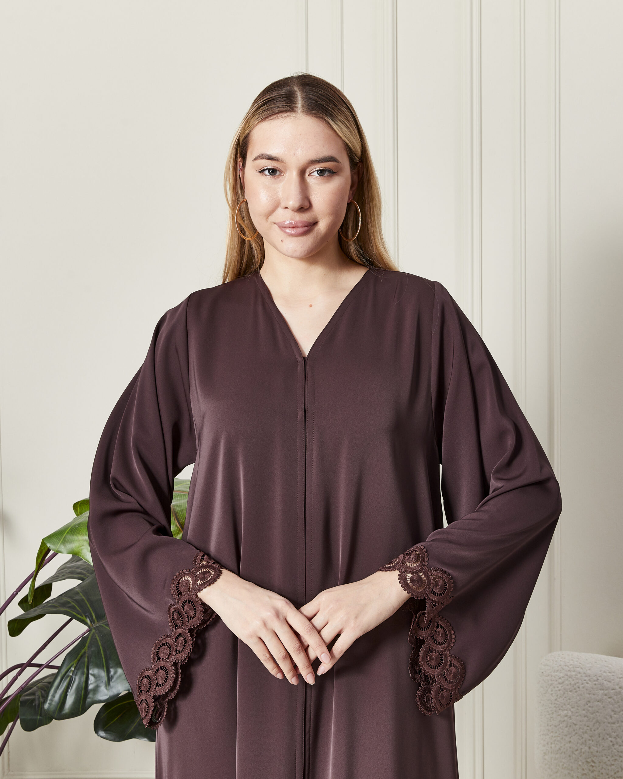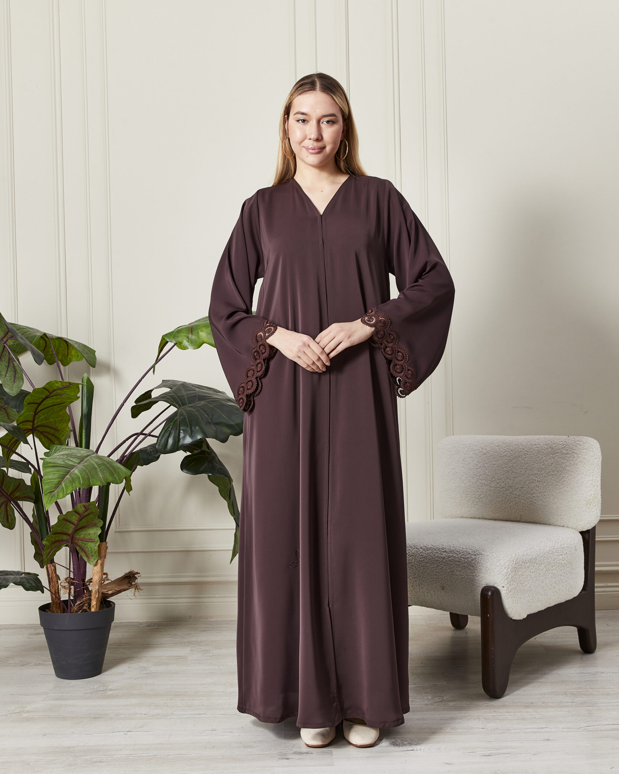 Sanatsal Fransız Detayı: Geniş kesim kolların uçlarında yer alan dairesel formdaki el işçiliği fransız danteller, abayaya sofistike bir hareket katmaktadır.