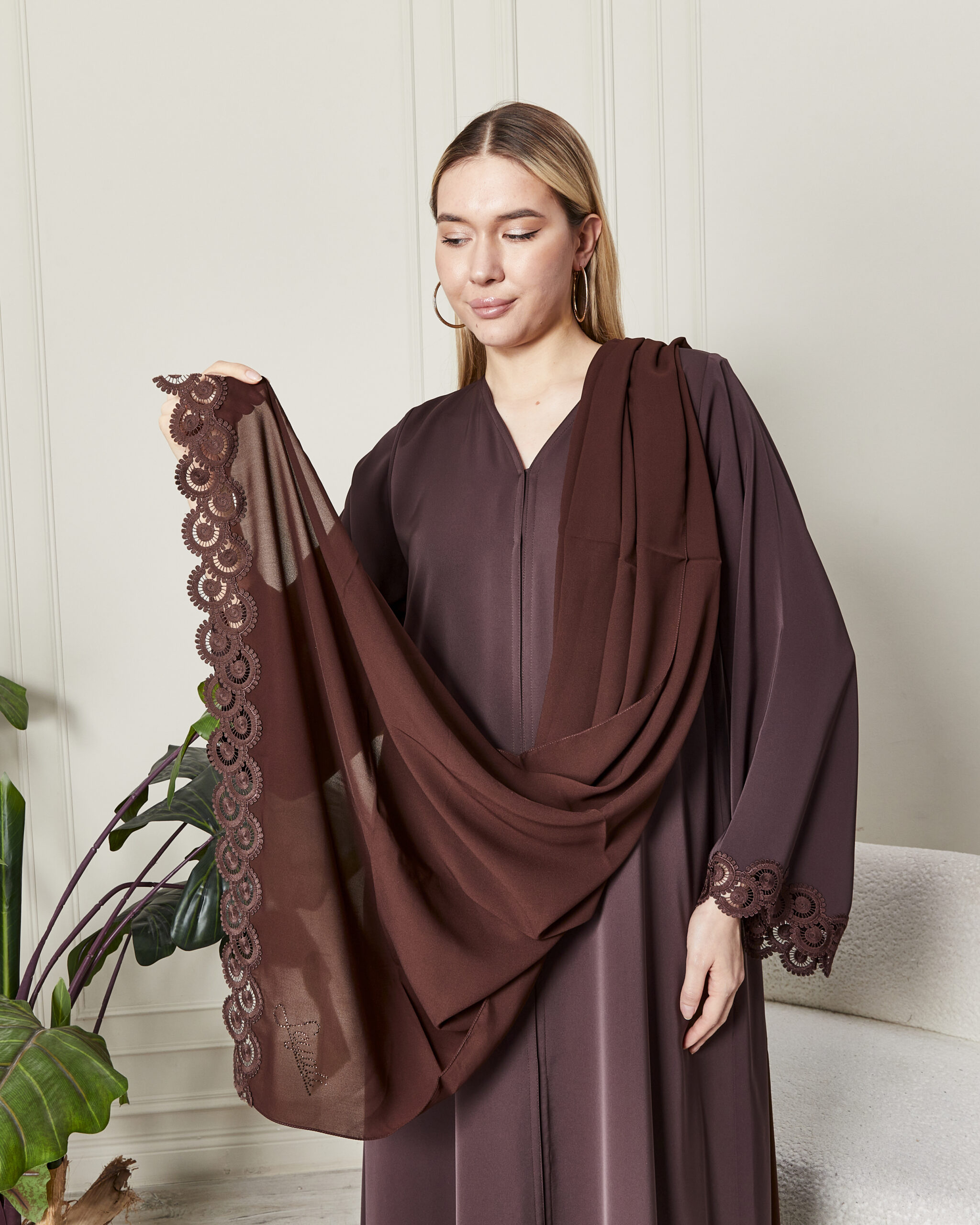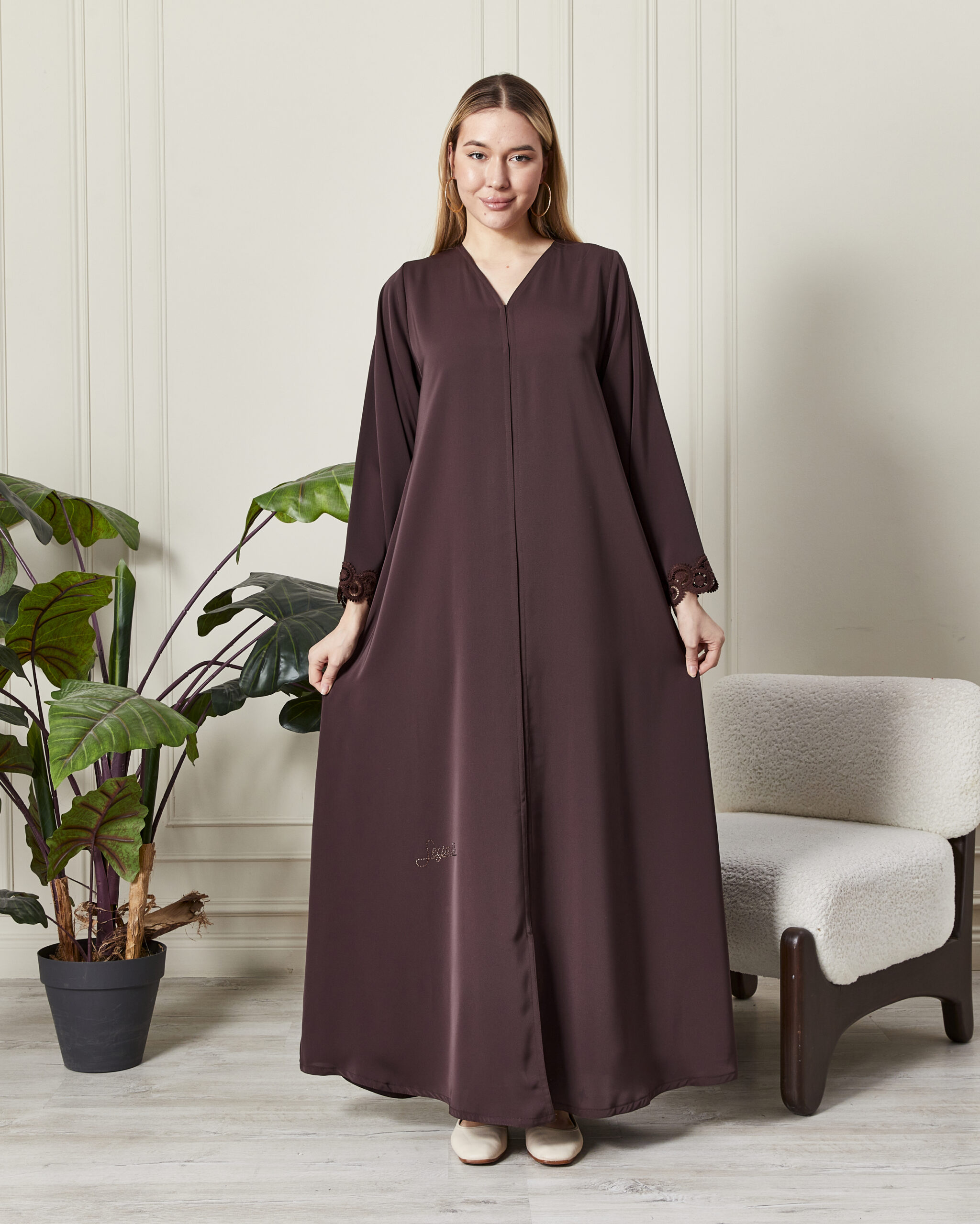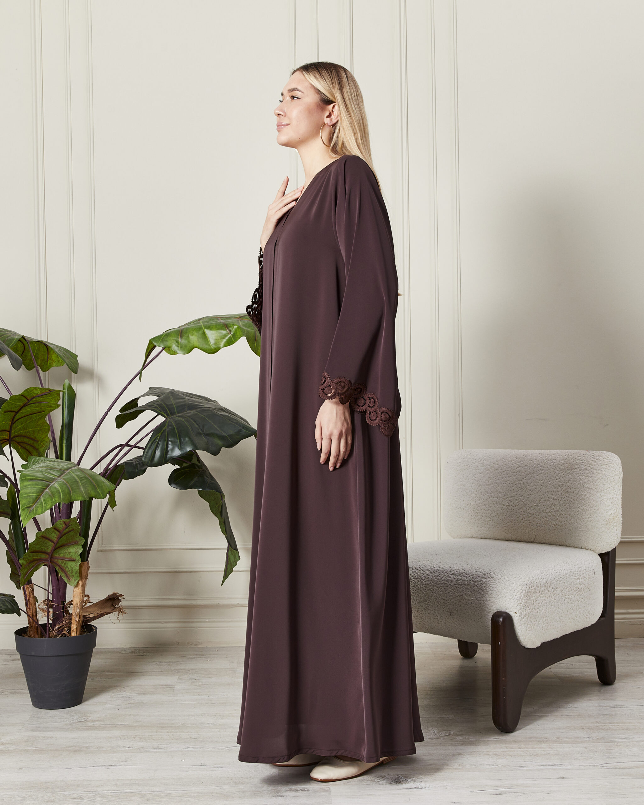 Leyali Dubai Fransız Dantel Detaylı Mürdüm İpek Abaya