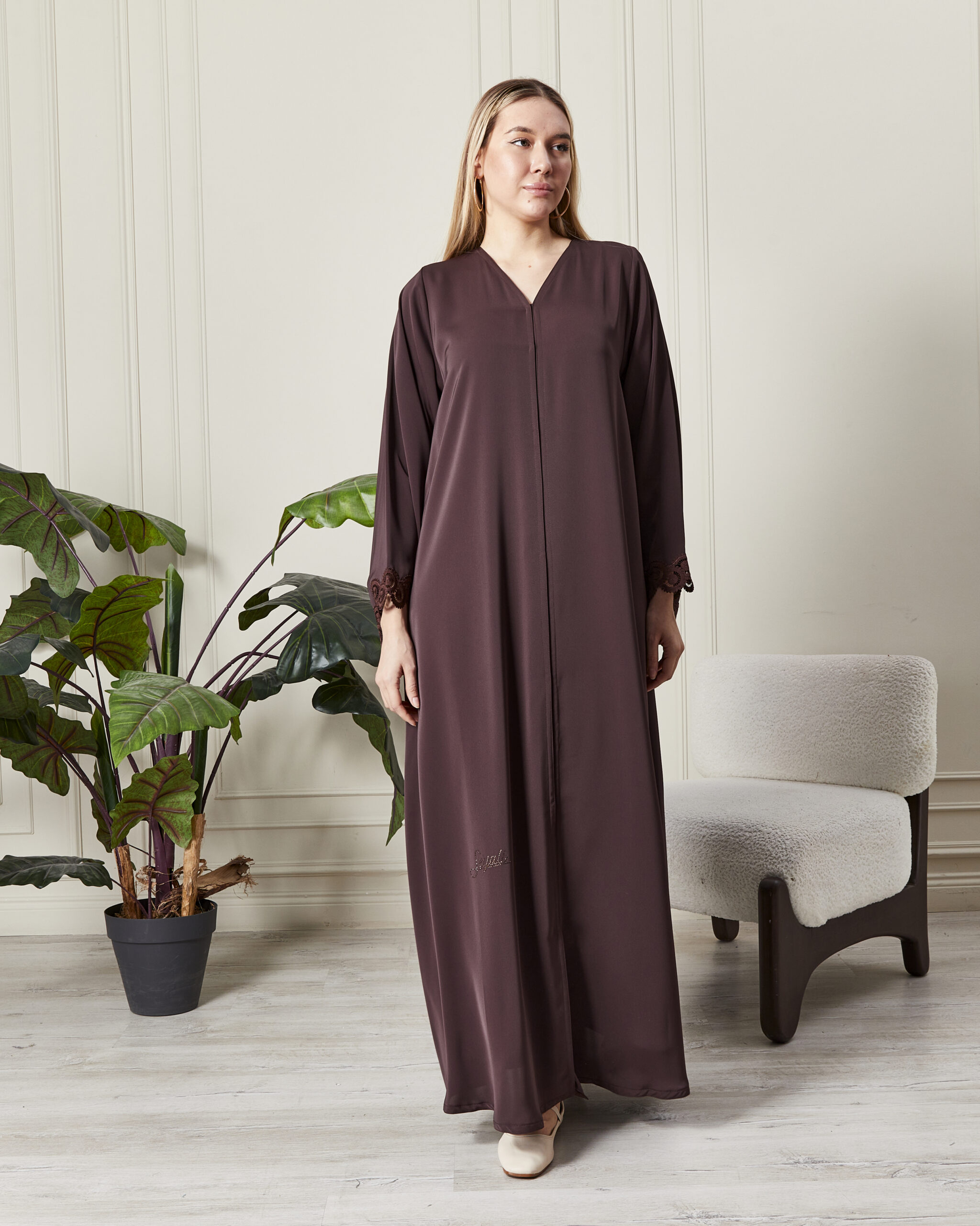 Zengin mürdüm tonunun en zarif haliyle tanışın. Leyali Dubai modelistleri tarafından tasarlanan bu parça, geleneksel dokunuşları modern bir silüetle harmanlıyor.