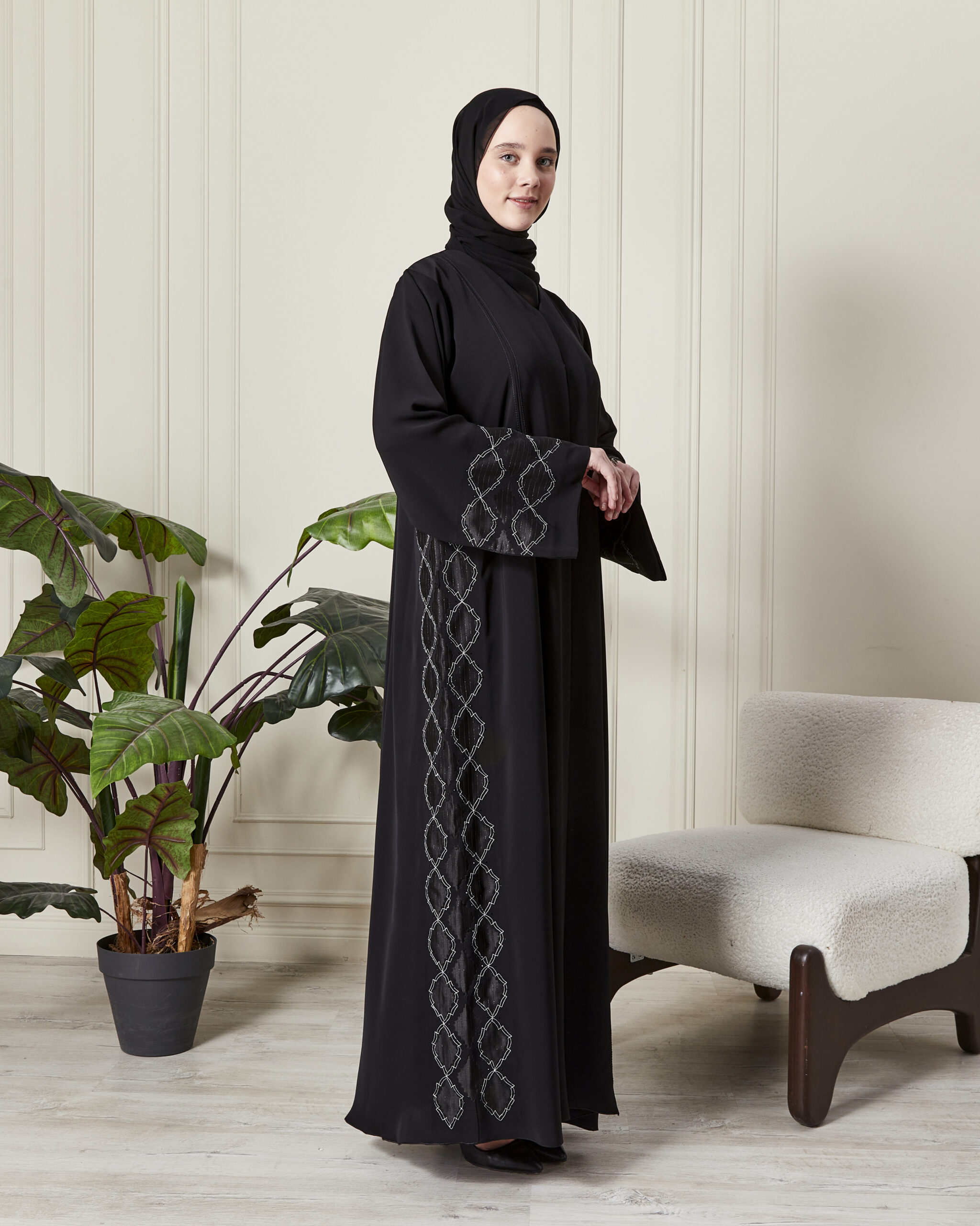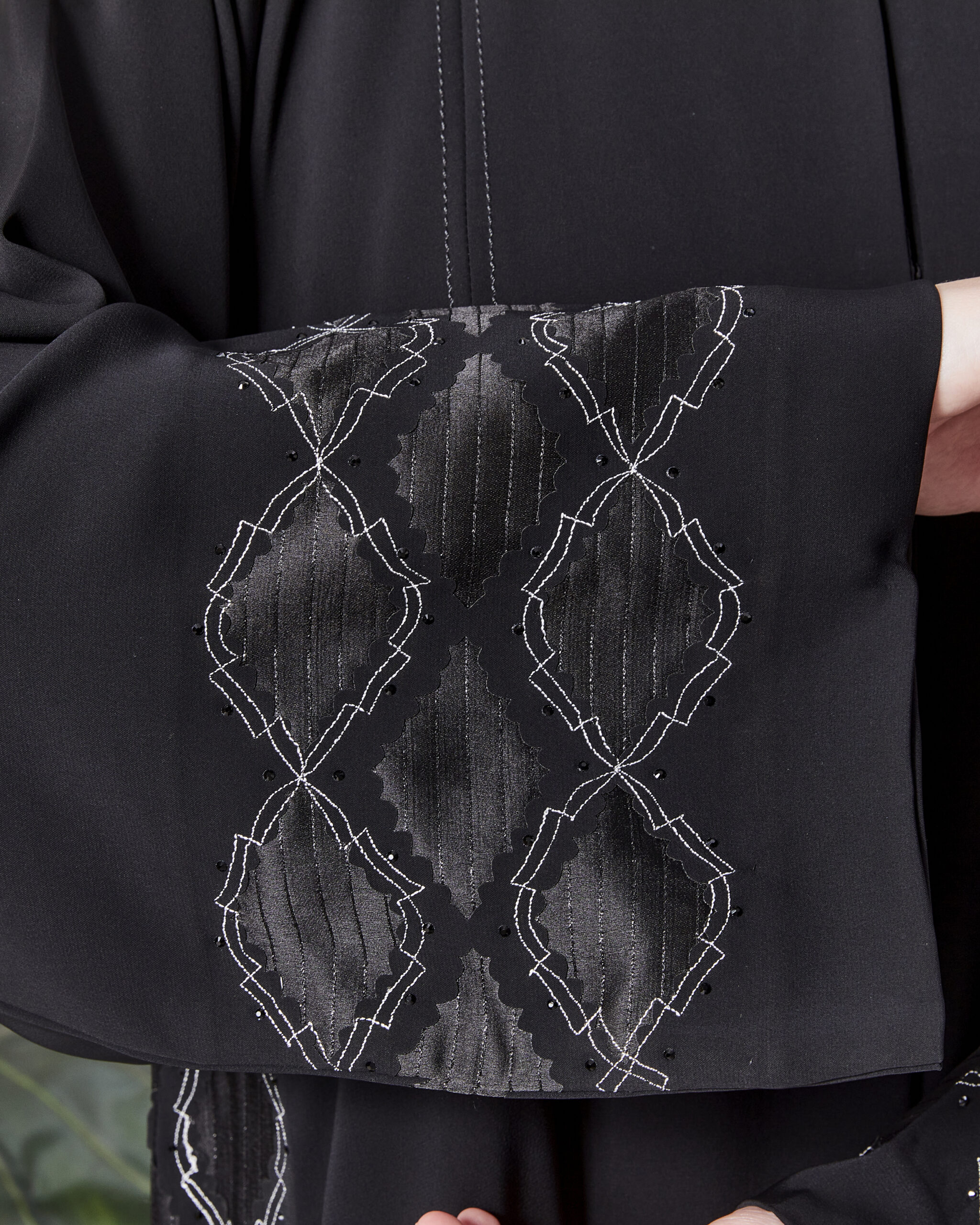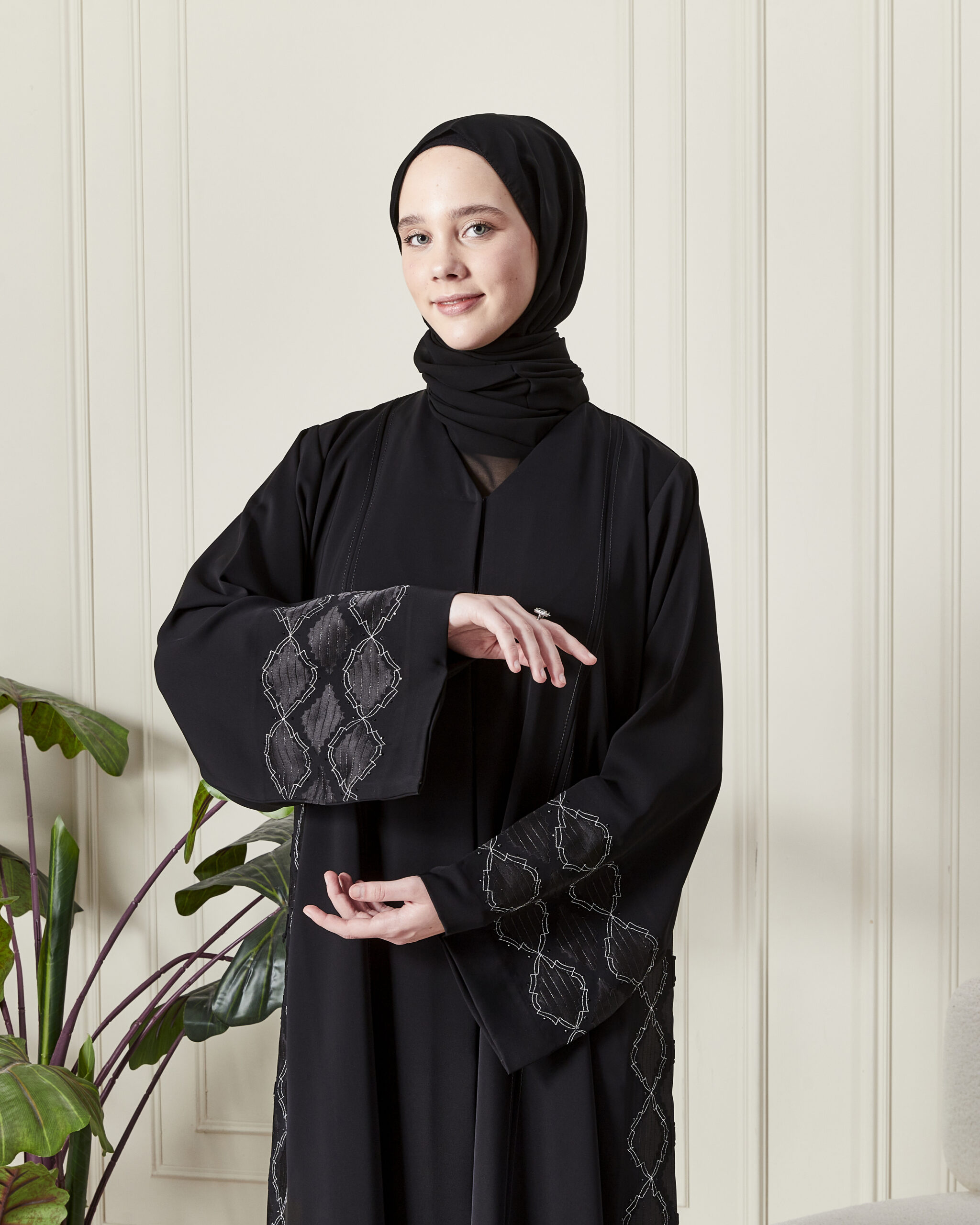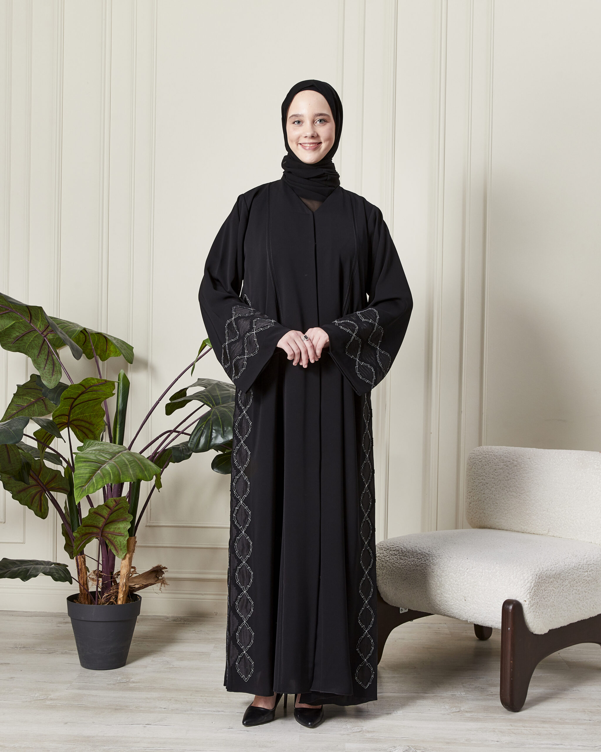 Klasik siyahın asaleti, modern geometrik taş işlemelerle buluşarak size hem geleneksel hem de çağdaş bir şıklık sunuyor. Leyali Dubai koleksiyonunun bu seçkin parçası, her adımınızda fark yaratmanız için tasarlandı.