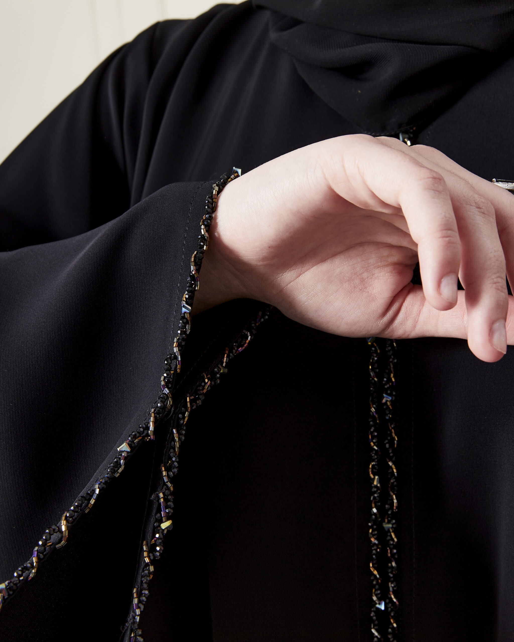 Bu görseldeki parça tam anlamıyla bir “masterpiece” yani ustalık eseri. 12 saat süren el emeği, bu feraceyi sadece bir kıyafet değil, taşınabilir bir sanat eserine dönüştürüyor.