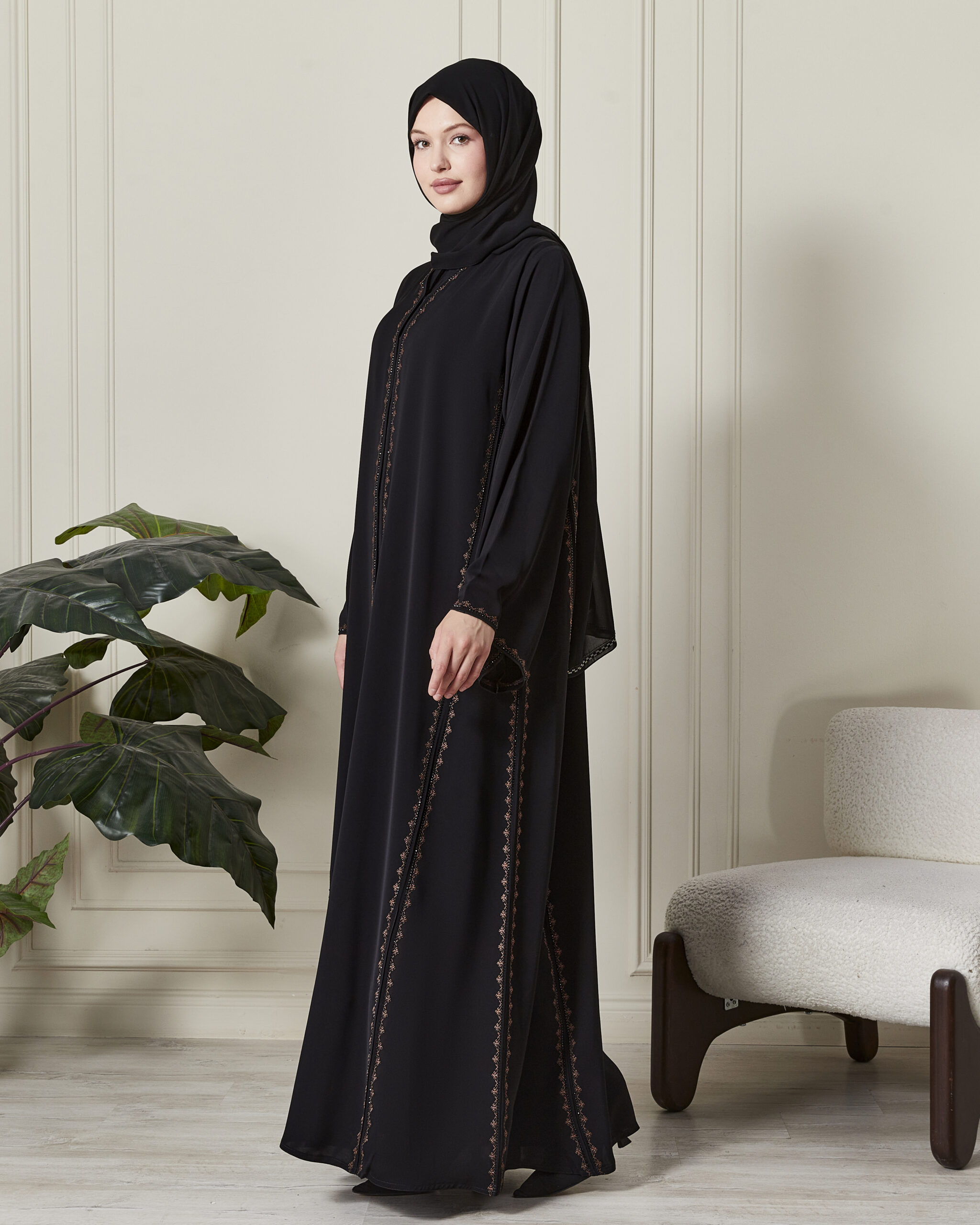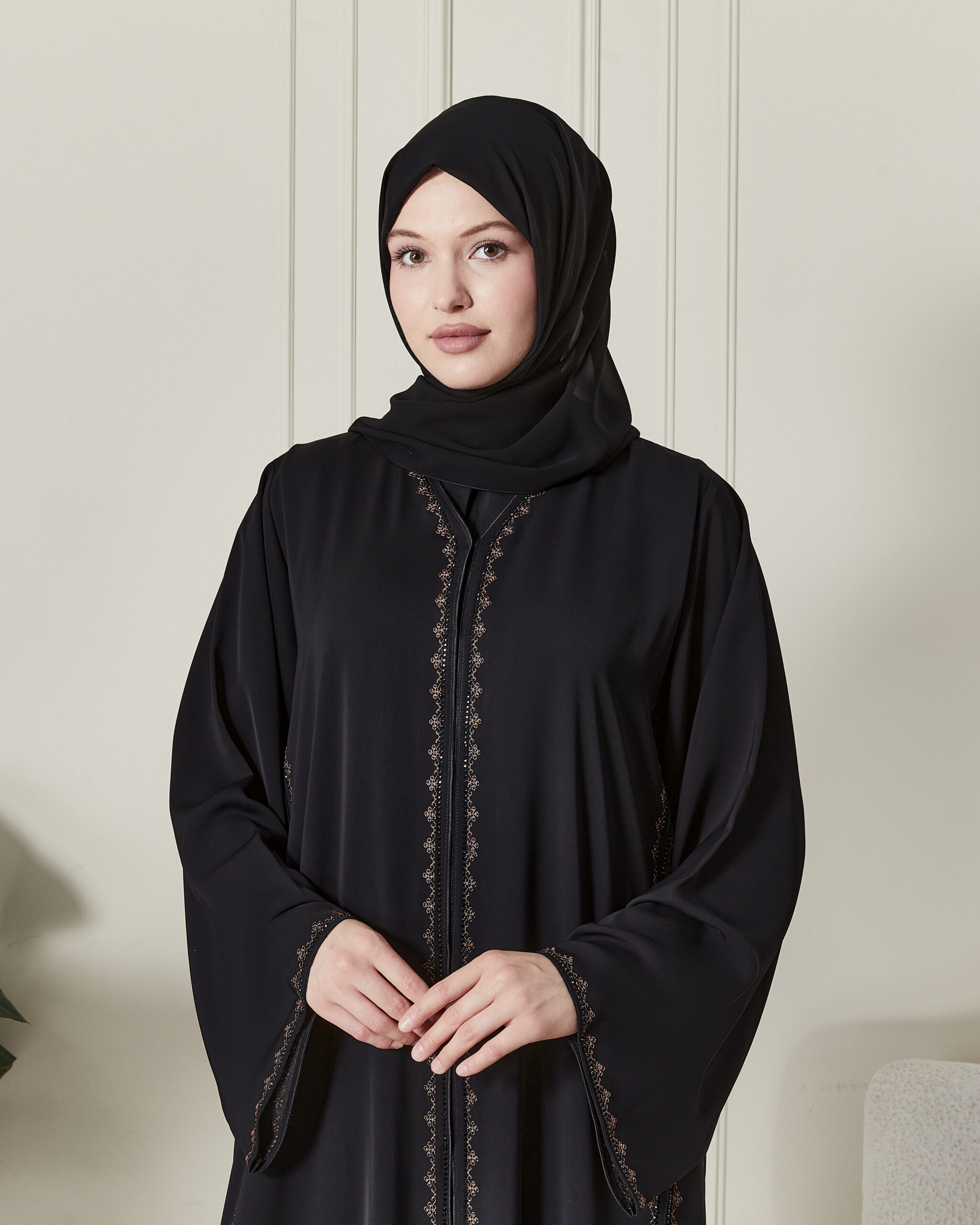 Kahve Nakış & Swarovski Detaylar: Abayanın ön panelinde ve kollarında yer alan kahve tonlarındaki zarif nakışlar, orijinal Swarovski taşların ışıltısıyla birleşerek zengin bir görünüm sunar.