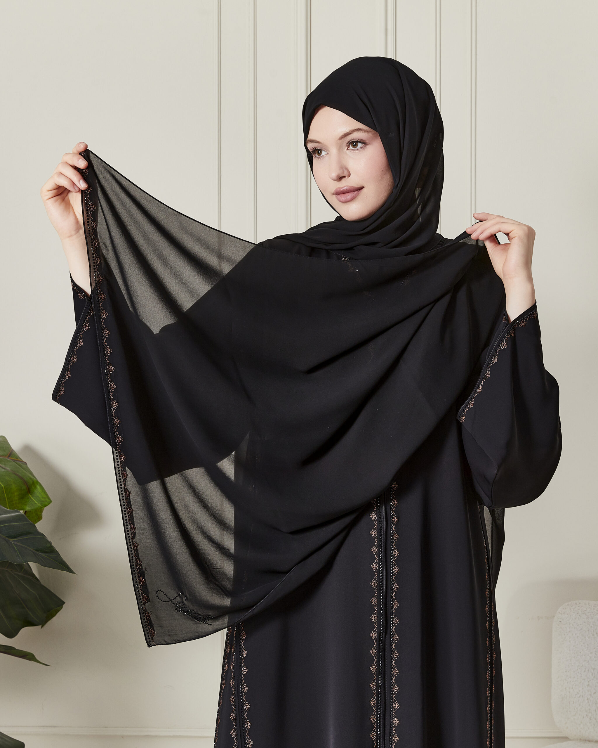 Siyahın asaletini, toprak tonlarının sıcaklığı ve kristal ışıltısıyla birleştiren bu çok özel tasarım, Leyali Dubai koleksiyonunun en seçkin parçalarından biri olarak öne çıkıyor. Dubai’nin lüks moda anlayışını yansıtan bu abaya, ustalıkla işlenmiş detaylarıyla fark yaratıyor.