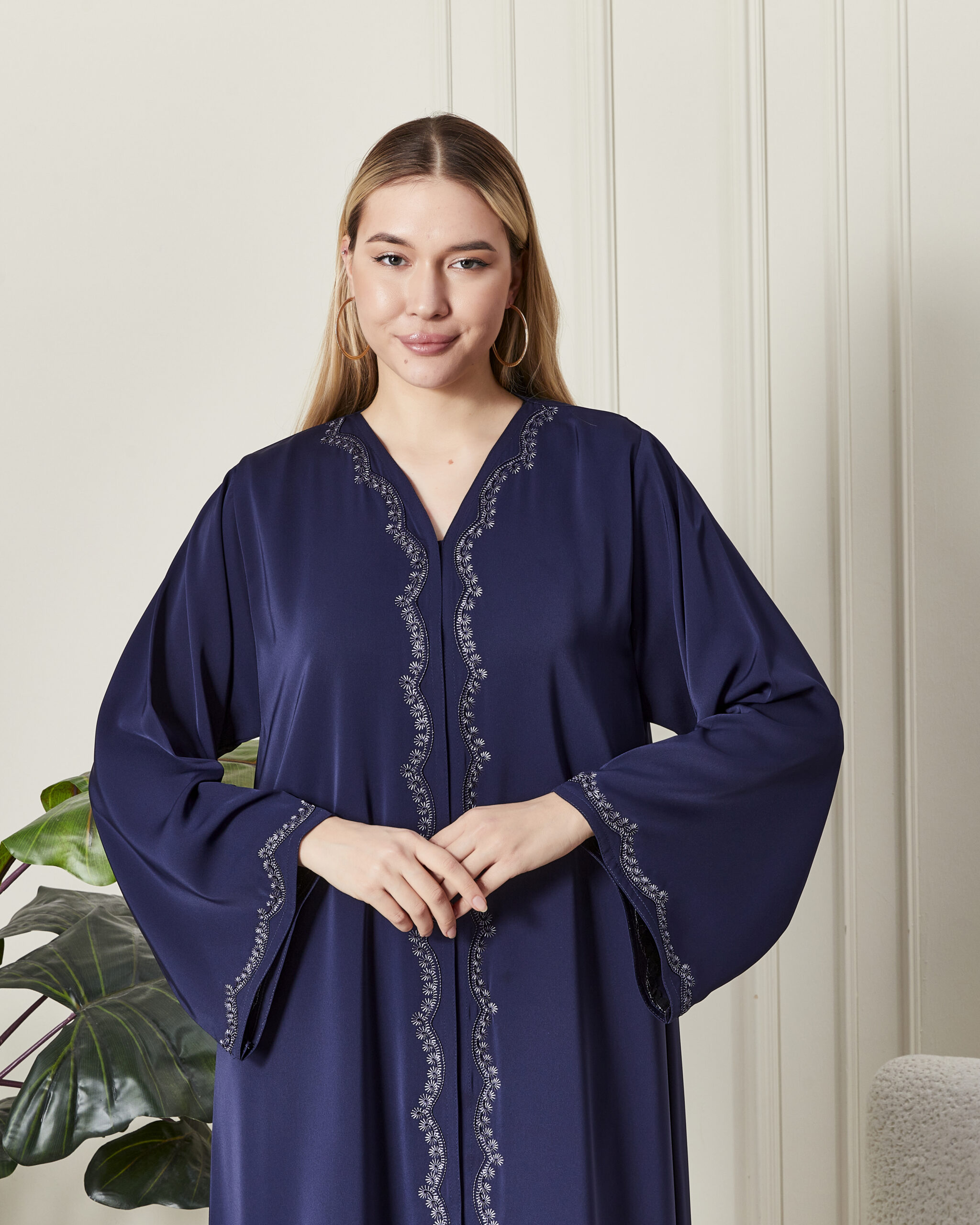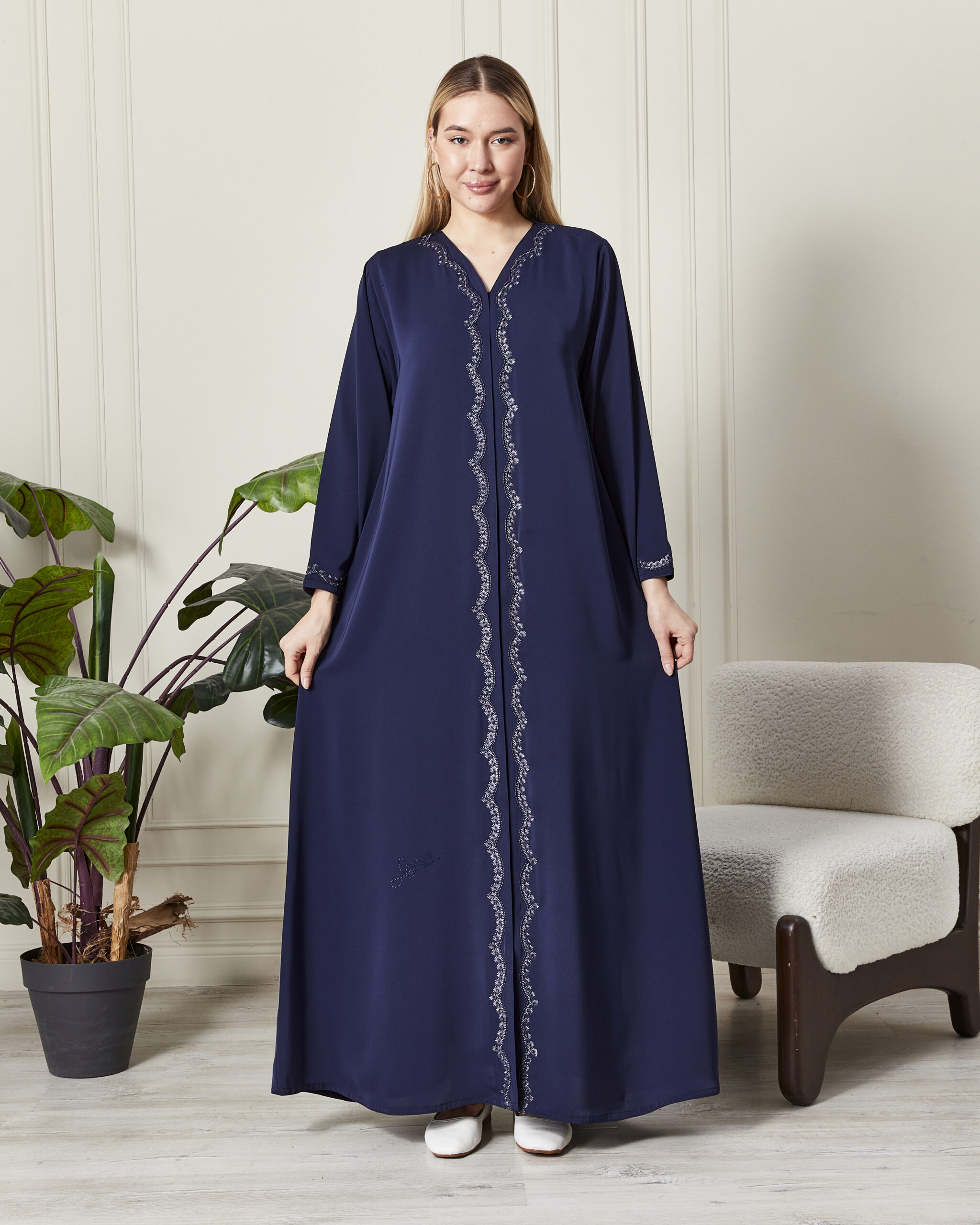 Leyali Dubai modelistlerinin çizgisel zarafeti ön plana çıkardığı bu özel tasarım, derin safir mavisi rengiyle göz kamaştırıyor. Dubai’de titiz bir işçilikle üretilen bu abaya, klasik detayları modern bir formla yeniden yorumluyor.