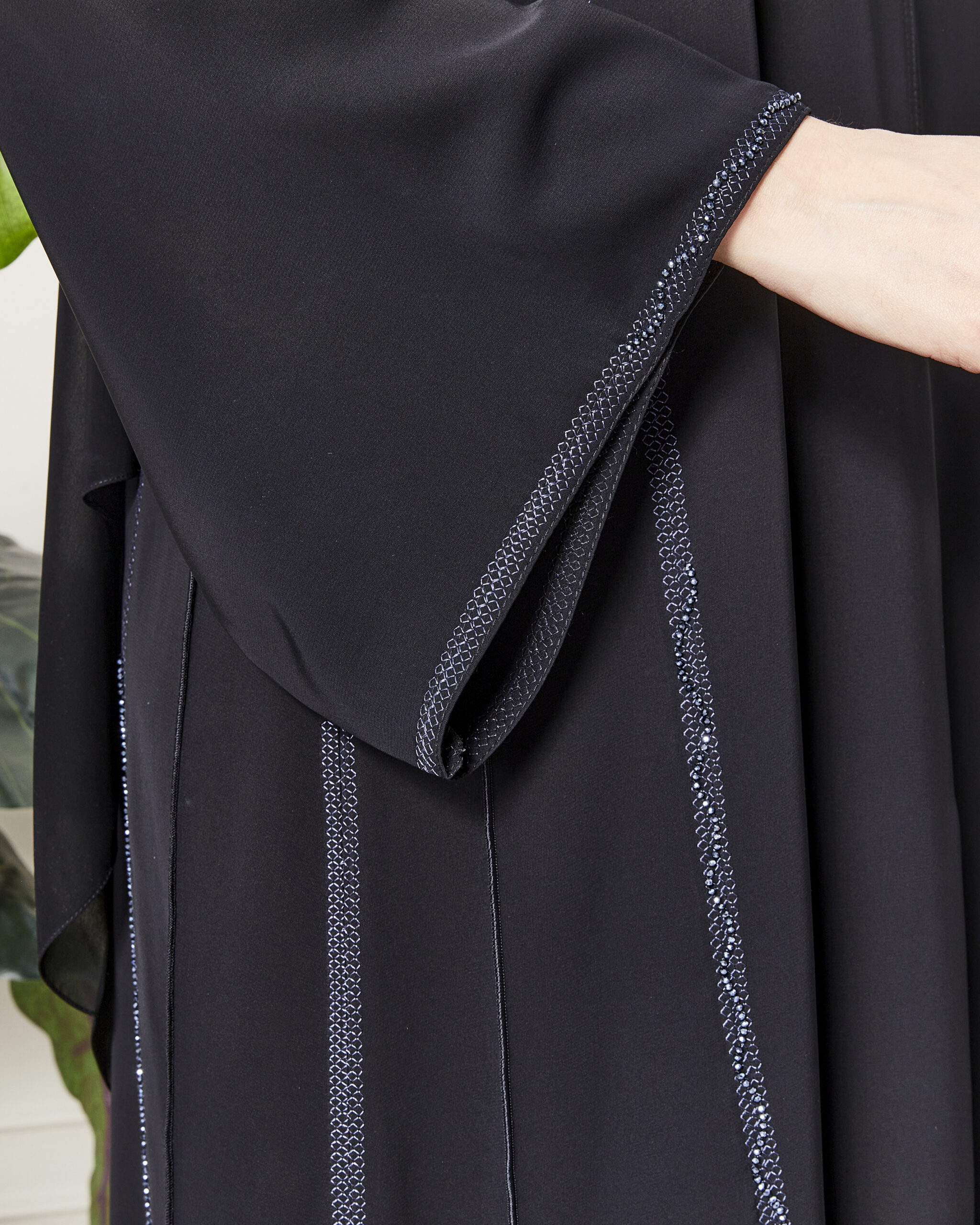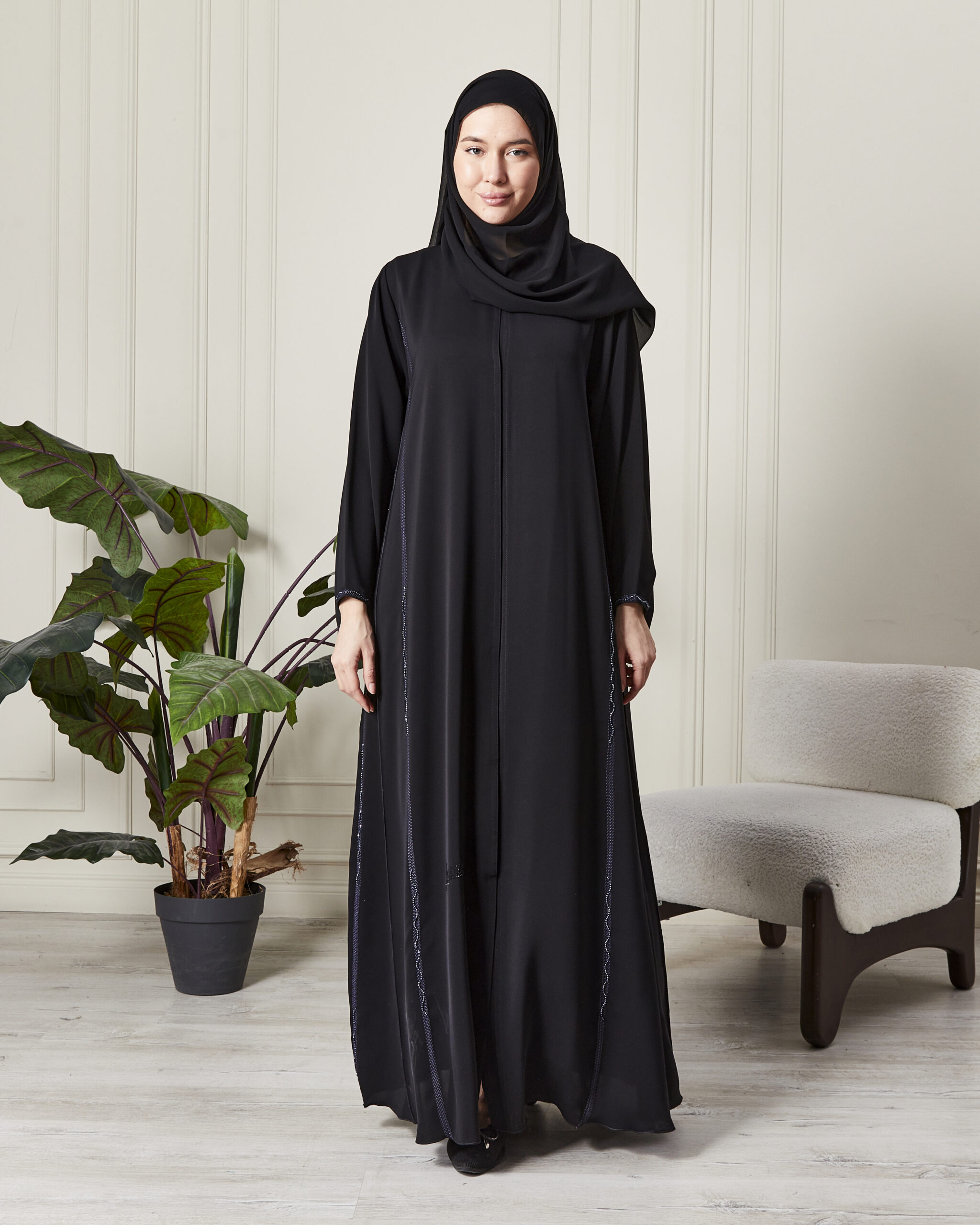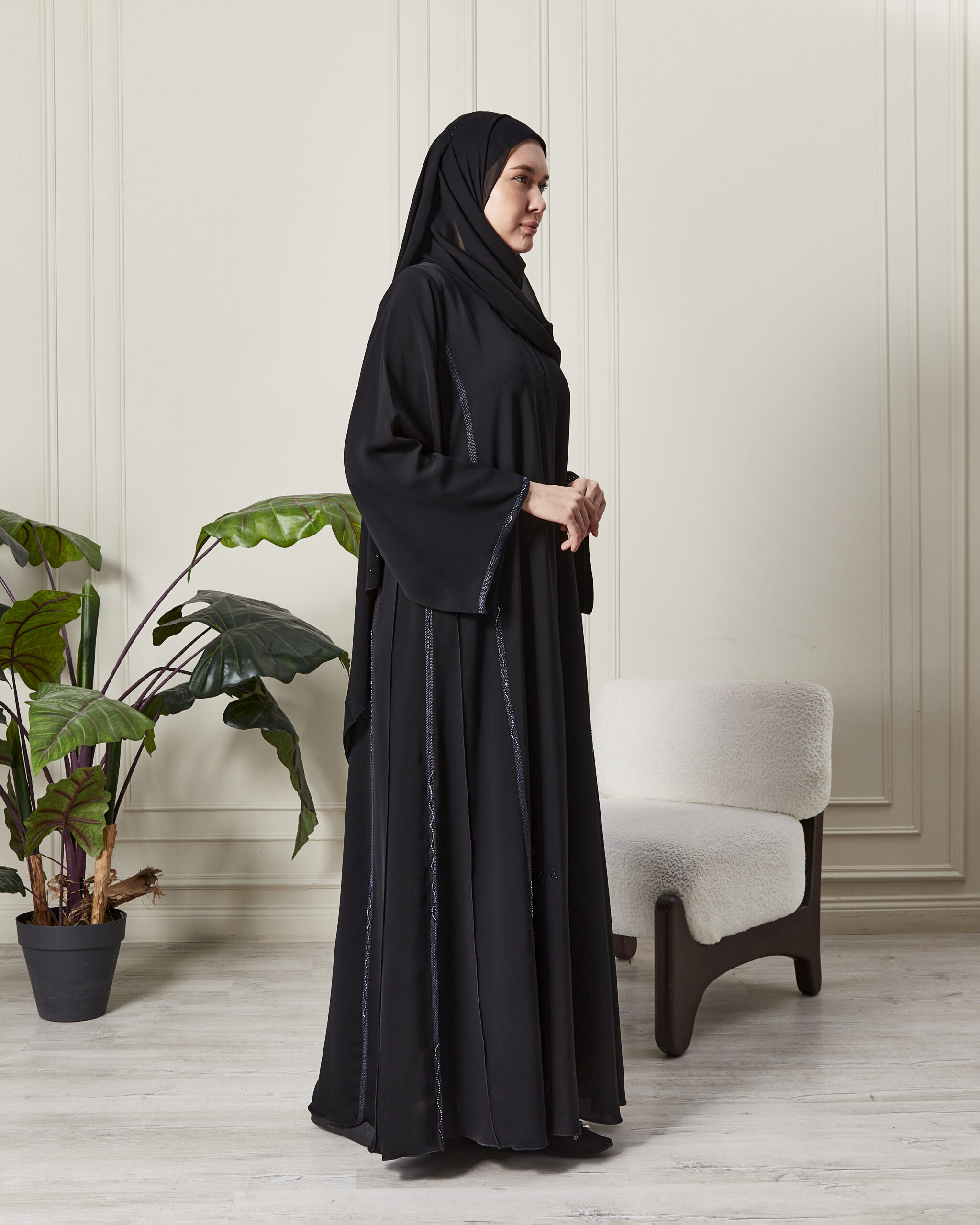 Mavi kristallerin yarattığı bu kontrast, tasarımı sıradan bir siyah abayadan çok bir sanat eserine dönüştürüyor. Kendi özel şalıyla kombinlendiğinde, davetlerde ve özel etkinliklerde tüm dikkatleri üzerinize çekecek, prestijli bir duruş sergilemenizi sağlayacaktır.