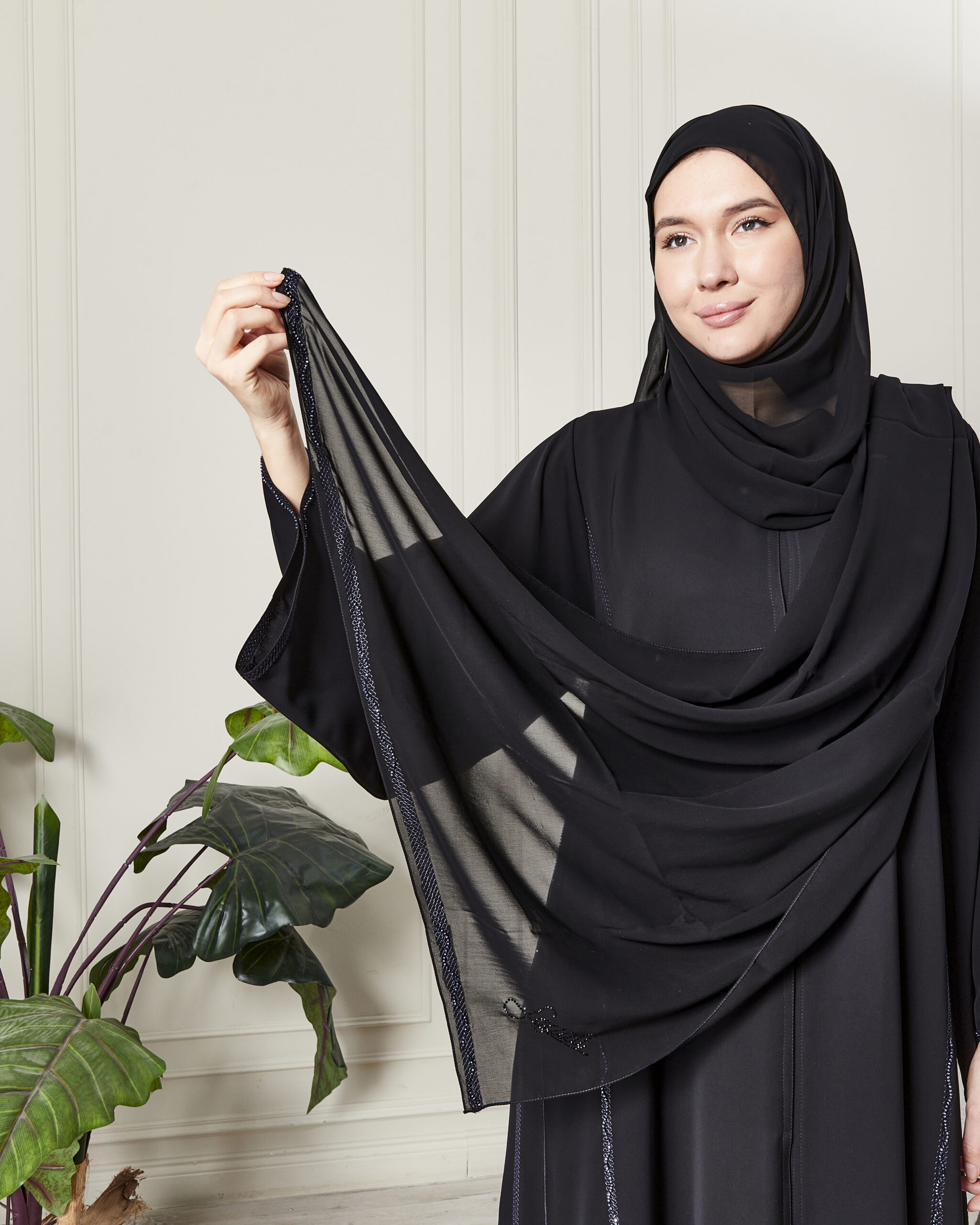 Leyali Dubai | Safir Işıltısı Swarovski İşlemeli Lüks İpek Abaya & Şal Takımı