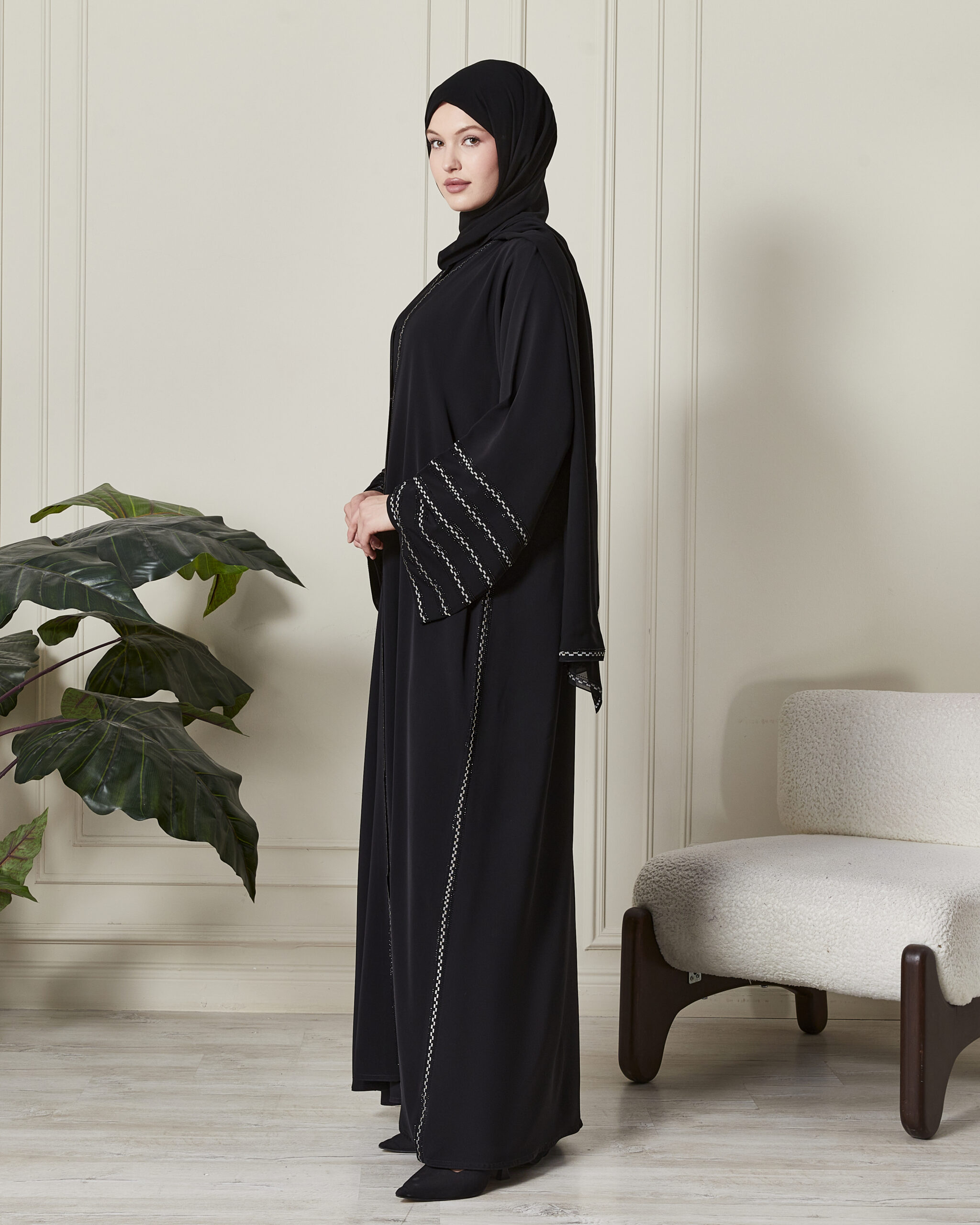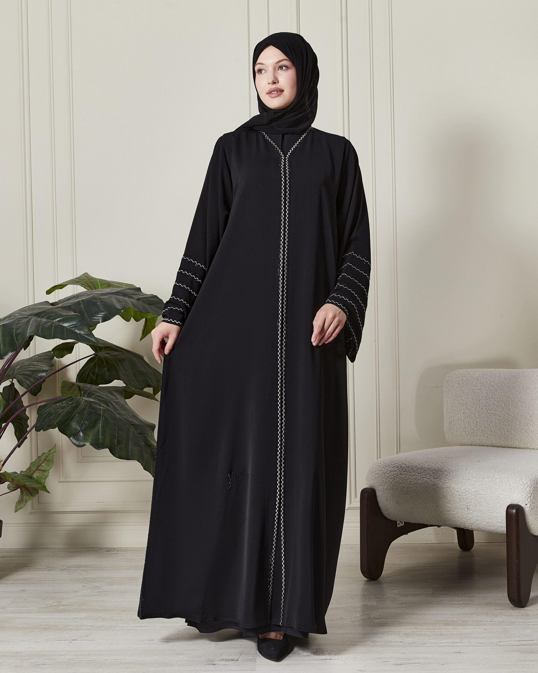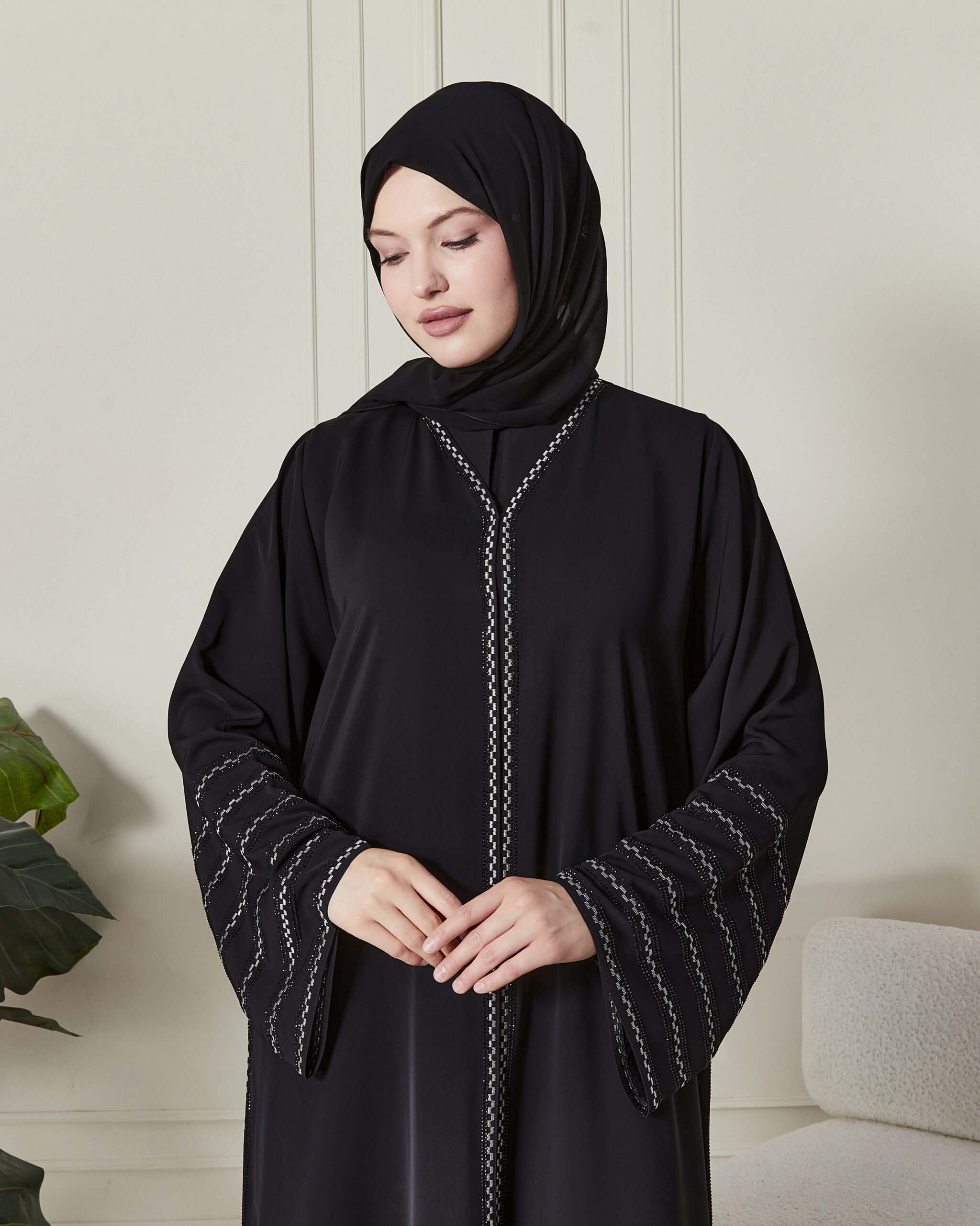 • Kristal Şerit İşleme: Abayanın ön kısmından aşağıya doğru inen ve kol ağızlarını süsleyen ince hatlı Swarovski taş işlemeleri, tasarıma rafine bir lüks katar.