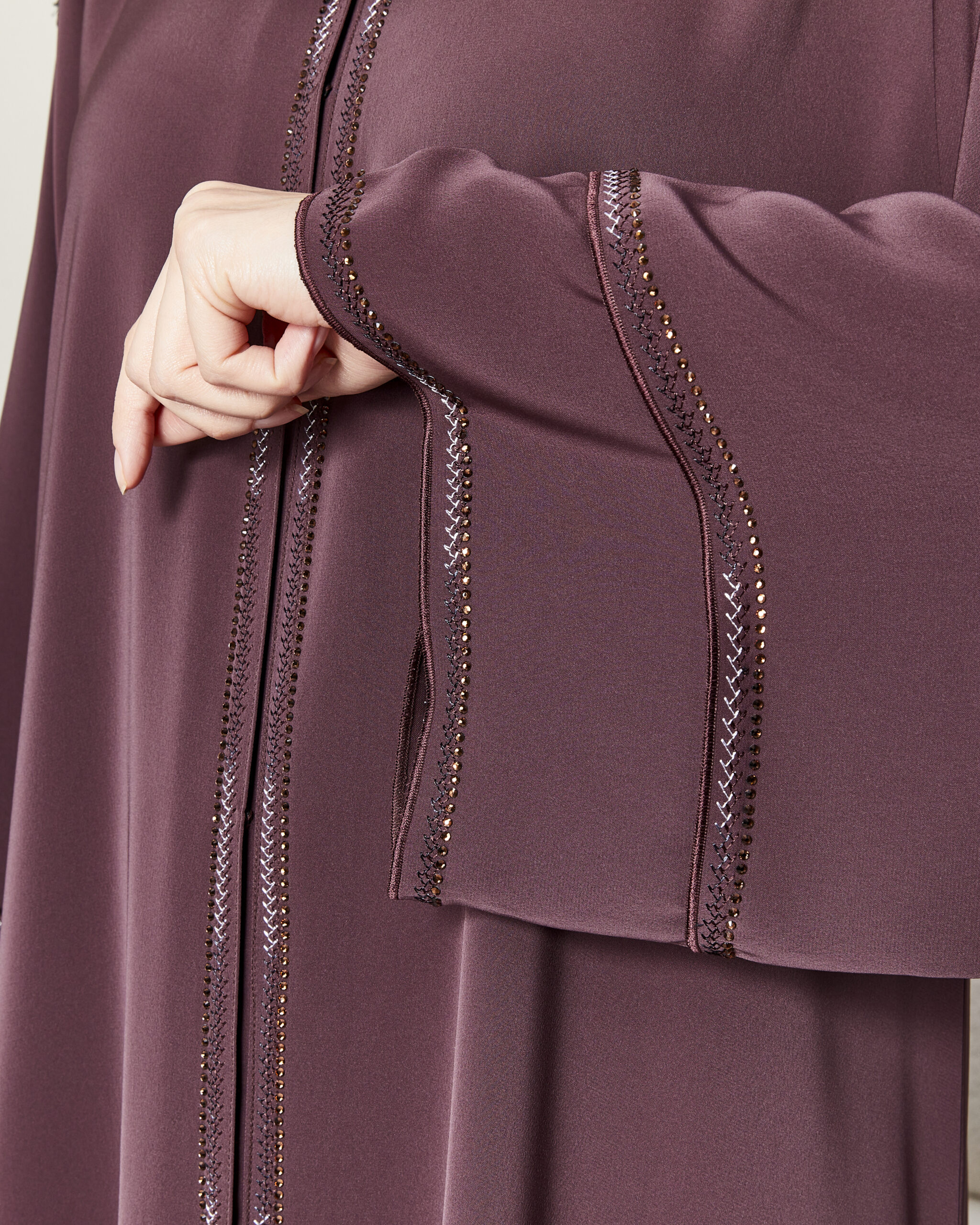 İnce İşçilikli Şeritler: Abayanın ön patı boyunca ve kollarında yer alan ince kristal taşlı şeritler, tasarıma modern ve dikey bir hat kazandırarak boyu daha uzun, silüeti daha zarif gösterir.
