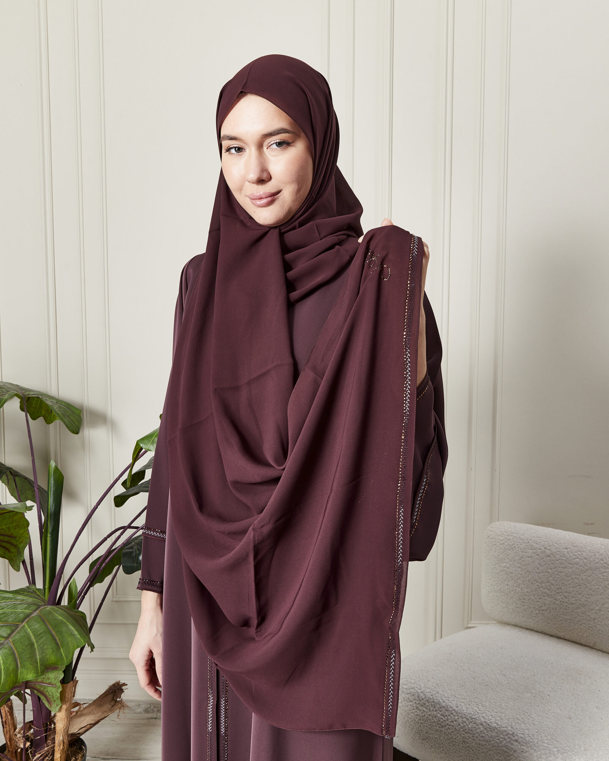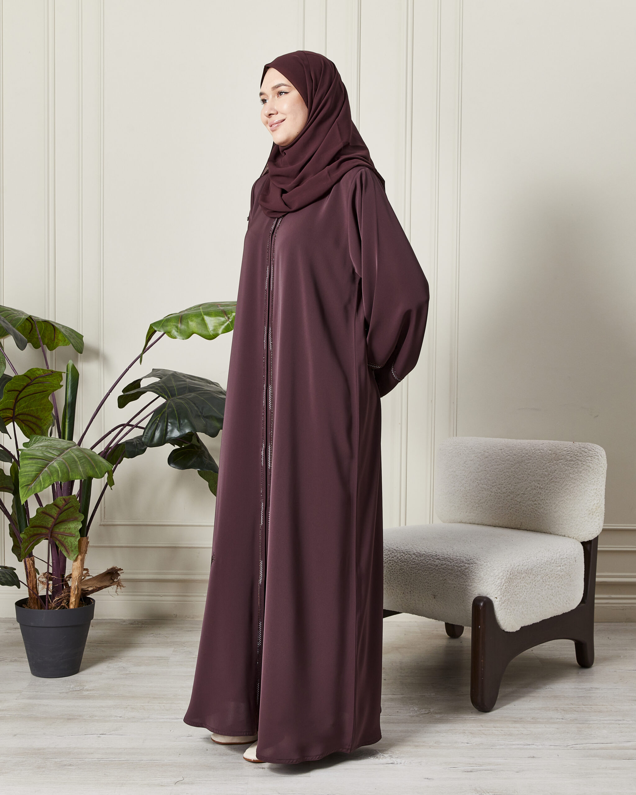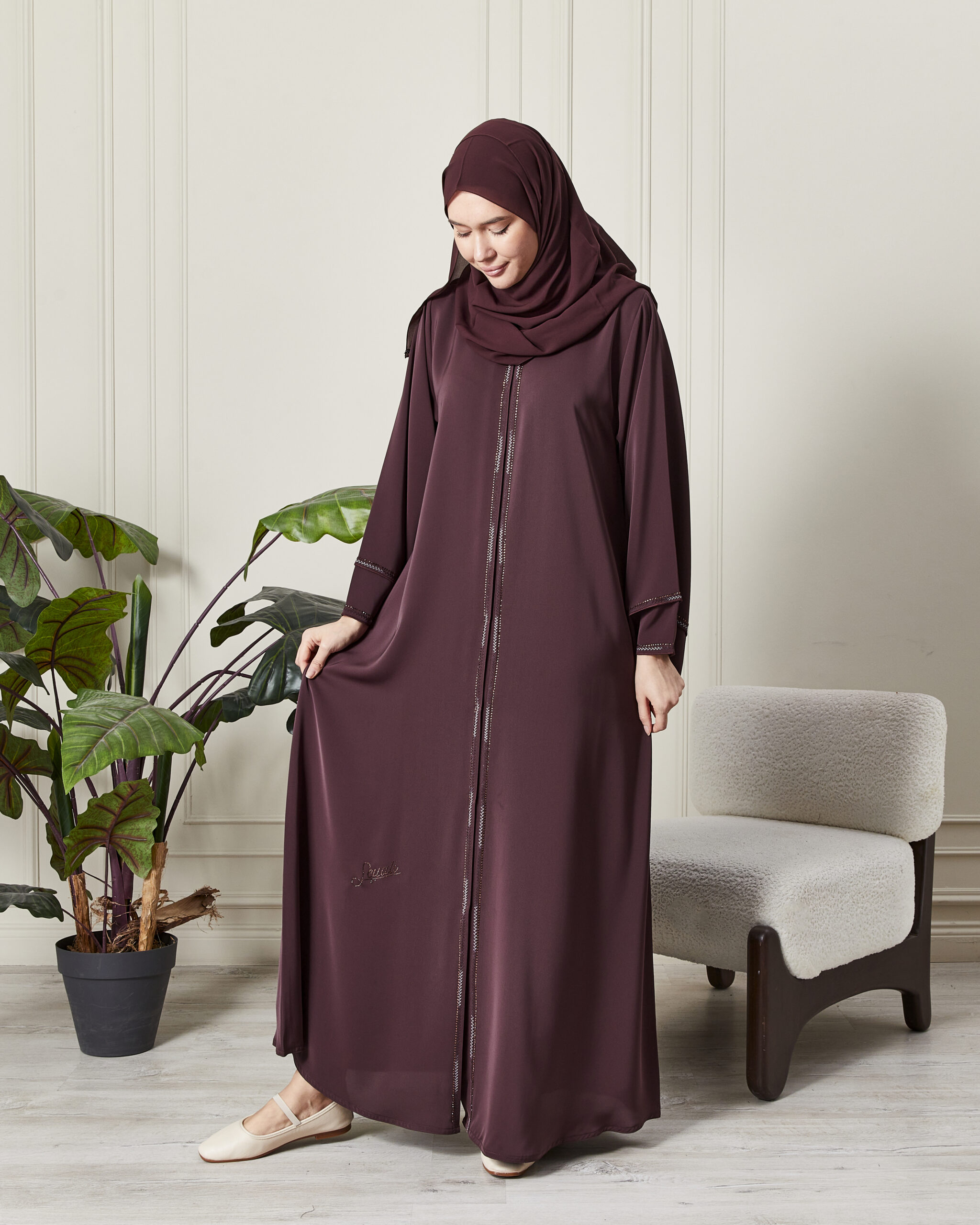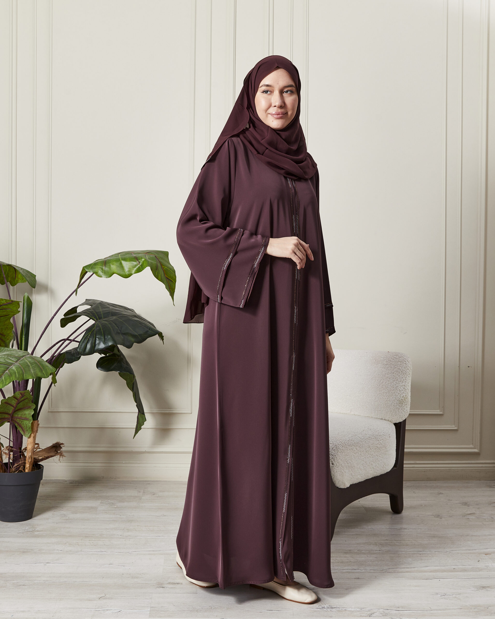 Leyali Dubai | Zarif Şerit Detaylı Mürdüm İpek Abaya